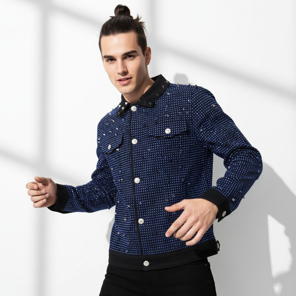 Perfect for performers, creatives, or anyone who lives boldly, the jacket features studded details along the collar, shoulders, and body for an edgy, elevated finish. Whether you're hitting the stage, attending a runway show, or simply turning heads on the street, this piece delivers standout glamour with versatile wearability.