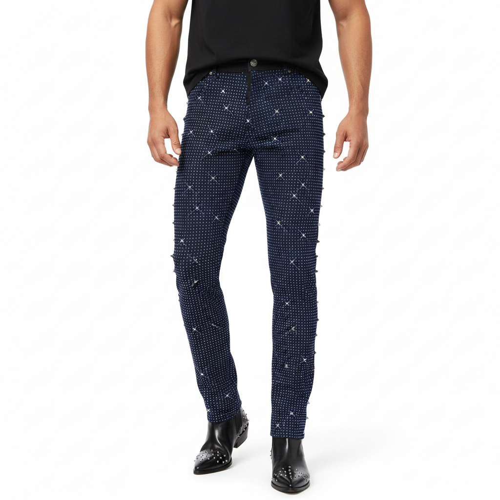 Dazzle with confidence in the Pure Style Pants, designed for those who crave a standout look. These skinny-fit pants are fully embellished in radiant rhinestones, delivering an unmatched 'bling' factor that commands attention. Whether you're at a red carpet event or heading out for a night on the town, these pants exude elegance with a dressy-casual edge. Crafted from stretch fabric, they offer maximum comfort and flexibility, maintaining a sharp, tailored silhouette. Bold yet refined, the Pure Style Pants strike the perfect balance between luxury and wearability.