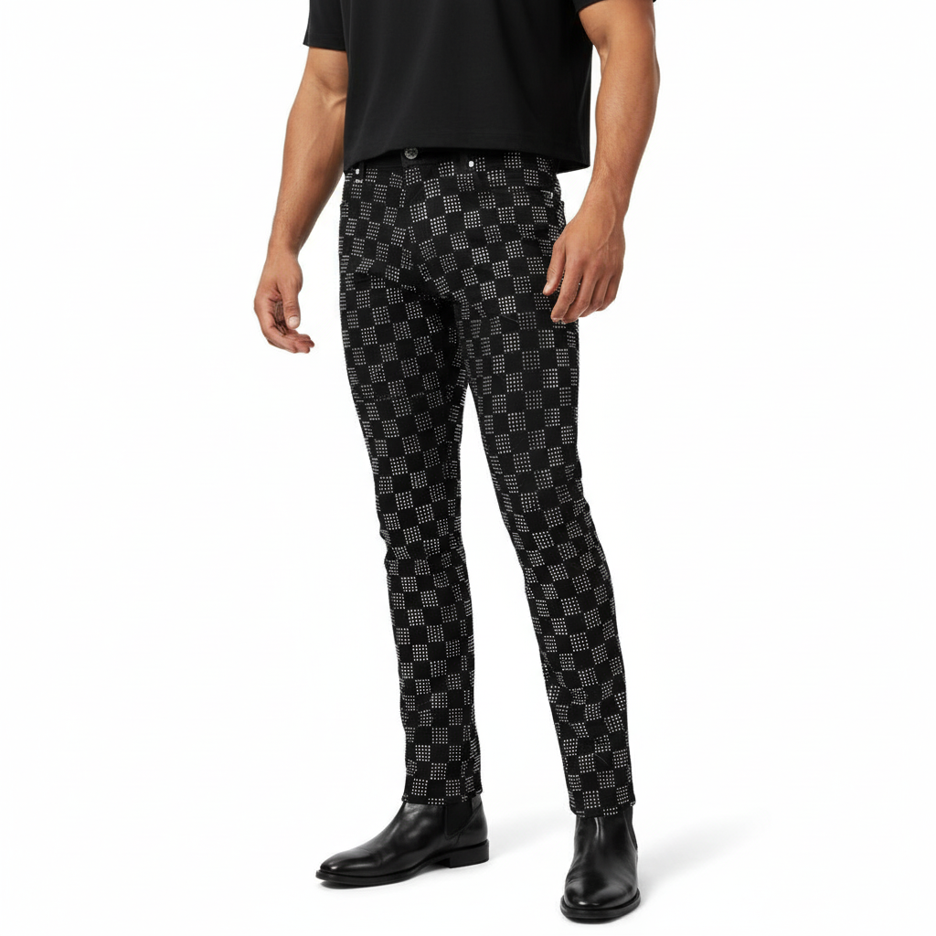Own the moment in the Dazzle Check Denim Pant, the perfect match to our statement-making jacket. Covered in checkered-pattern rhinestones, these pants are made for the spotlight—designed to catch the light and every eye in the room. Ideal for performers, trendsetters, or anyone looking to turn heads, this standout piece balances bold shine with all-day comfort. A stretch fit ensures freedom of movement, while tailored lines keep the look sleek and elevated. Pair it with the jacket or wear solo—either way, you're center stage.