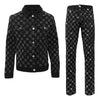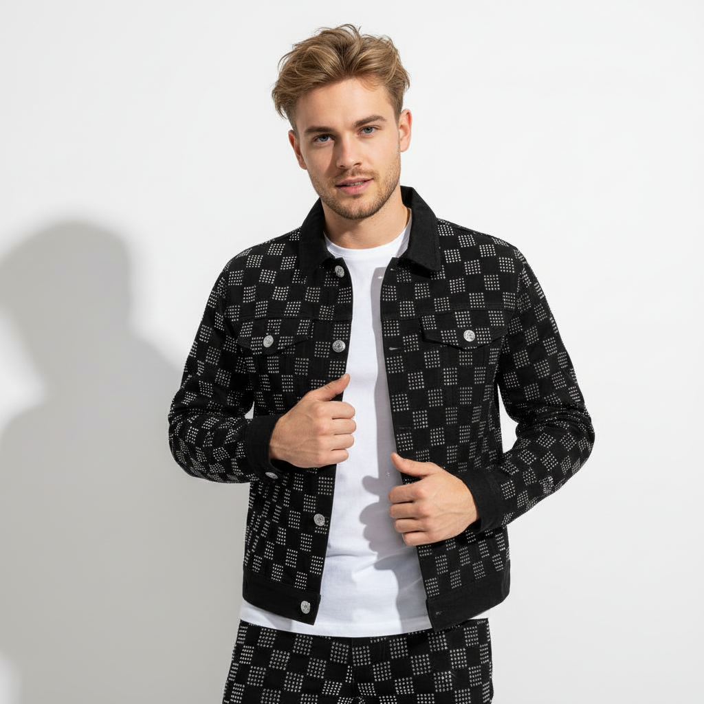 This set includes a statement denim jacket and matching pants designed for performers and fashion-forward occasions. Both pieces feature checkered-pattern rhinestones and tailored, stretch-infused construction for comfort and mobility. The signature embellishments and sleek silhouettes create a standout look suitable for stage performances or bold streetwear styling.