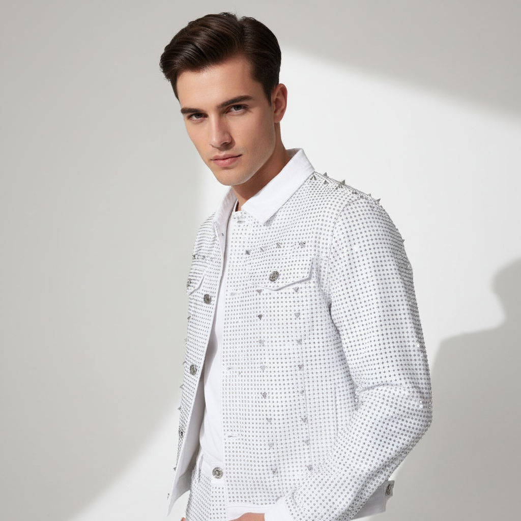 • Studded details on the jacket collar, shoulders, and body