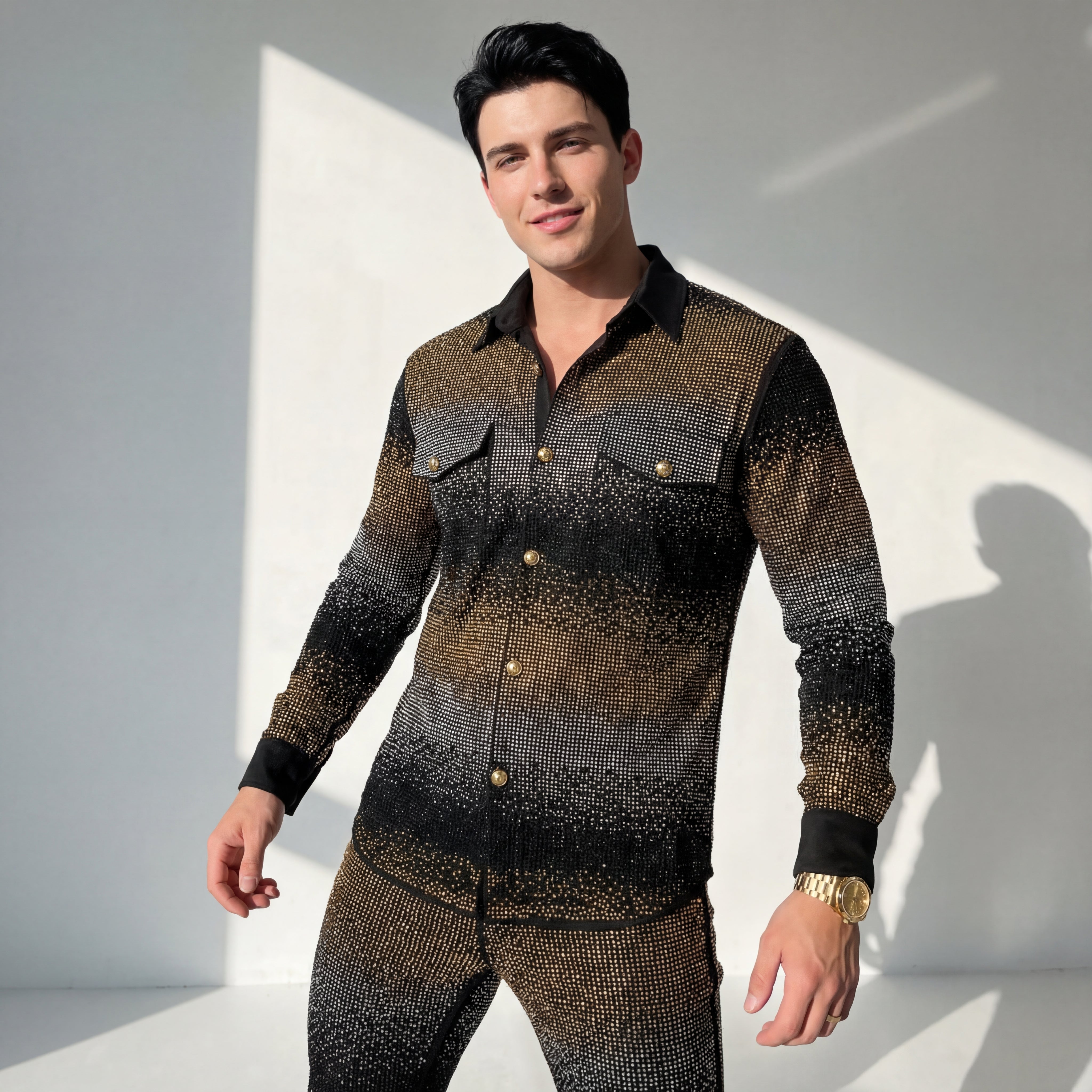 The Stage Blaze Set is a coordinated jacket and pant set designed for performance and special occasions. Both pieces are fully embellished with rhinestones for a consistent, all-over finish. The set is tailored with a slim fit and made from a stretch fabric for ease of movement. It is intended for stage wear, red carpet appearances, and high-profile events.
