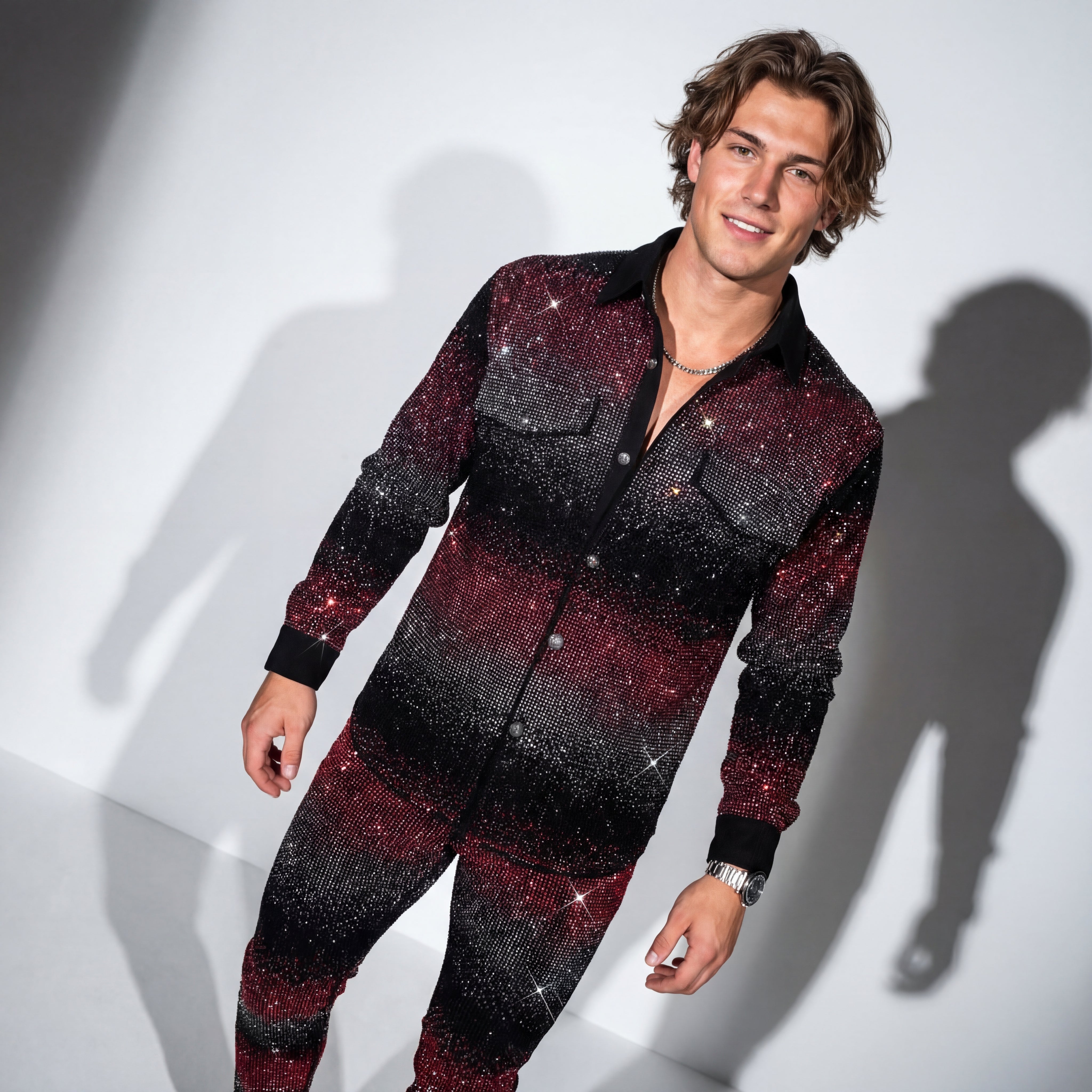 The Stage Blaze Jacket and Pants are a coordinated set designed for stage and event wear. Both pieces feature full rhinestone embellishment for a consistent look. The set is made with a stretch fabric for comfort and movement. Suitable for performances, red carpet appearances, and special events.