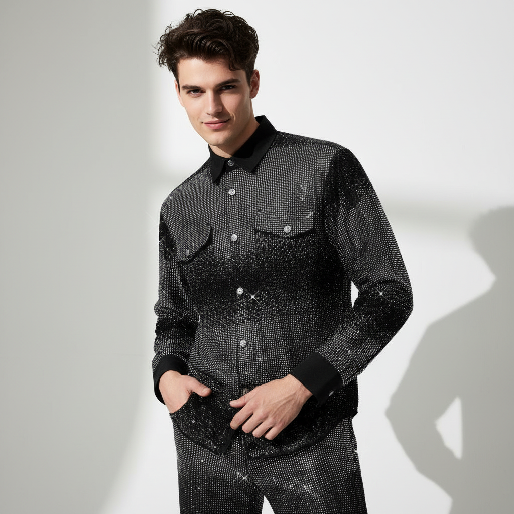 The Stage Blaze Jacket and Pants Set is a coordinated statement outfit designed for stage and special events. Both pieces feature all-over rhinestone embellishment for a unified look. The set is tailored with a slim fit and made from a stretch fabric for ease of movement. Suitable for performances, red carpet appearances, and high-profile occasions.
