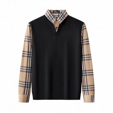 This long-sleeve hybrid sweater shirt delivers a modern interpretation of timeless menswear. A refined sweater front is paired with smooth plaid-pattern sleeves and collar, creating a layered look without the bulk. The contrast between textures brings elevated dimension, while the clean neckline and tailored structure keep the piece polished. Designed for versatile styling, it transitions seamlessly from casual refinement to upscale smart dressing.