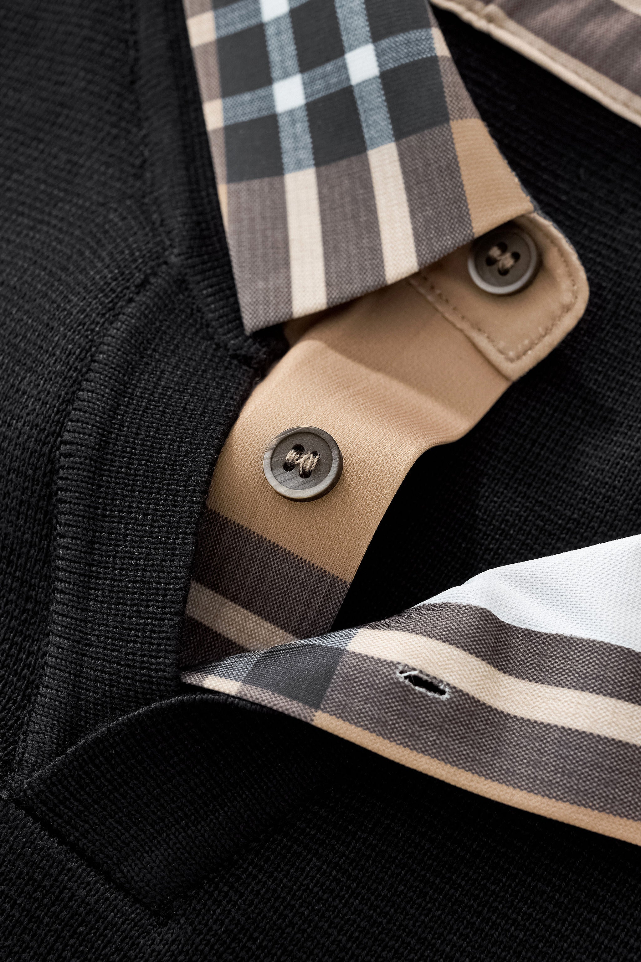 Hybrid construction with a sweater-knit body and woven plaid sleeves
