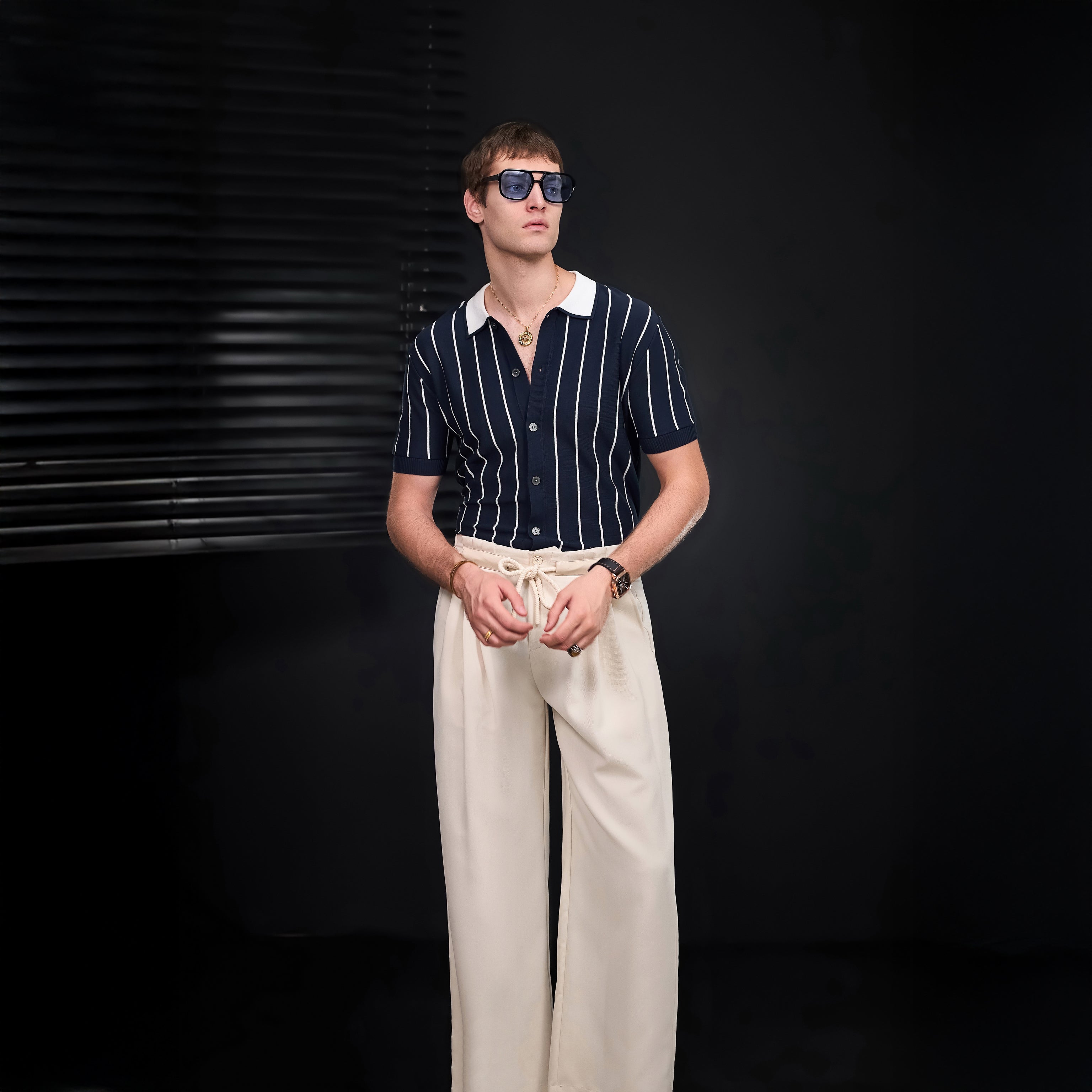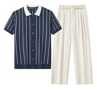 This set merges vintage charm with modern simplicity. The ModStripe Knit Shirt features clean vertical stripes and a contrast collar, bringing a graphic edge to relaxed dressing. Paired with the Belmont Pleated Trousers, which offer a wide-leg silhouette and drawstring waist, it’s a style-forward combination that flows with ease while maintaining quiet refinement. Ideal for warm days, casual events, or anytime you want effortless polish.