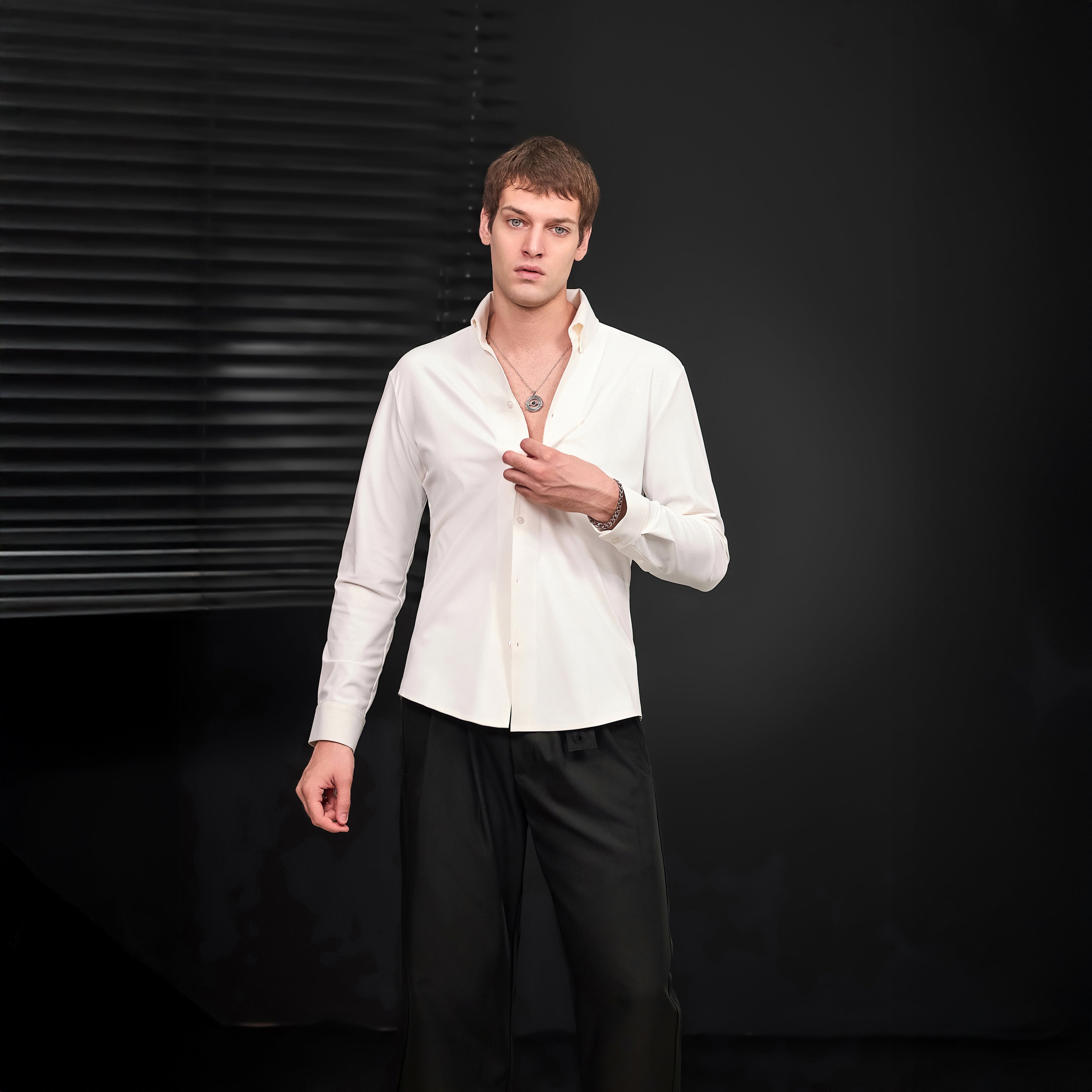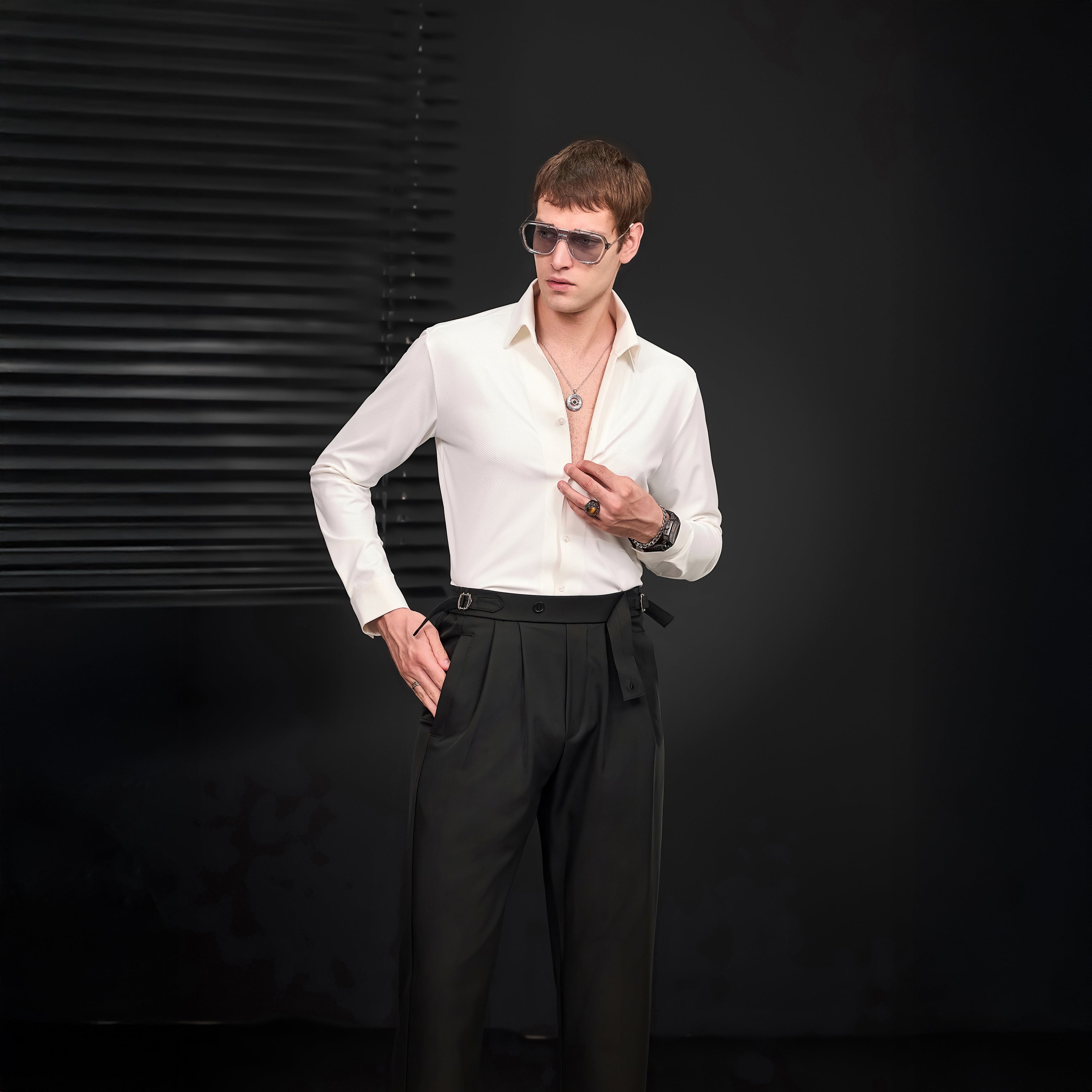 This set brings together two modern essentials that are simple, sharp, and seriously easy to wear. The Noir Essence Shirt, in crisp white, is all about clean lines and comfort. It’s made with 4‑way stretch fabric, so it moves with you while still holding its shape. The Wellington Side‑Tab Trousers are equally refined—wide-leg, pleated, and finished with adjustable tabs at the waist for a perfect fit. Together, they deliver a look that’s timeless but never boring.