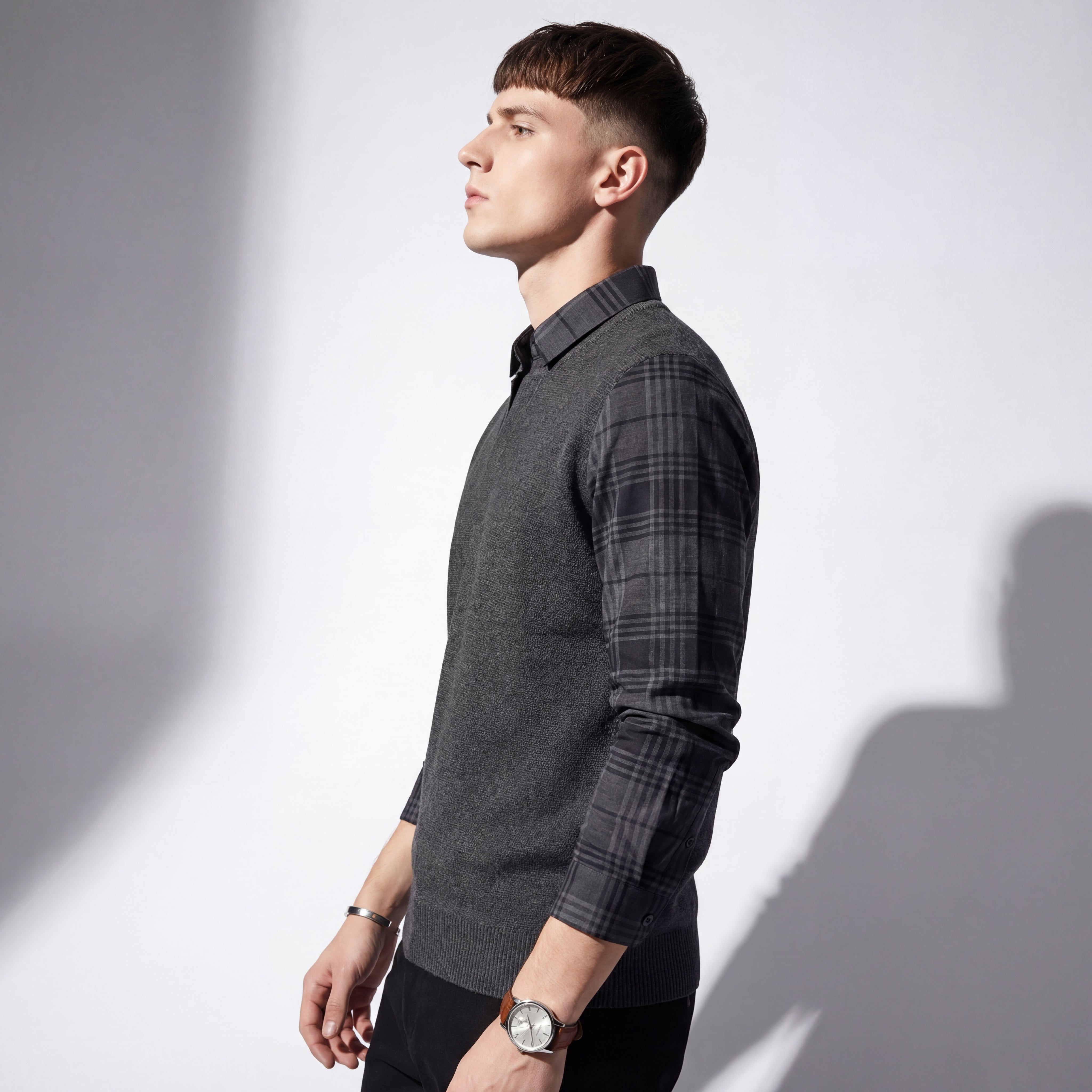 Plaid-pattern woven sleeves for subtle contrast