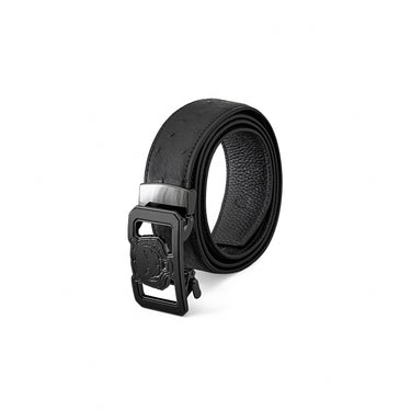 Command attention with the bold contrast of ostrich-embossed leather paired with a gunmetal lion buckle. This belt blends heritage texture with modern edge, creating a versatile accessory that transitions seamlessly between formal refinement and statement streetwear. Its automatic buckle closure ensures a perfect fit every time while the intricate detailing of the lion insignia elevates the look with strength and authority.