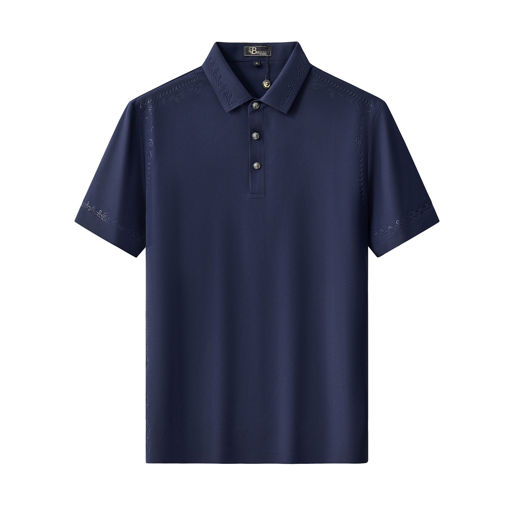 A refined interpretation of modern luxury, the Ornate Trim Polo elevates the classic silhouette with intricate tonal detailing along the collar, sleeves, and shoulders. Crafted from a smooth performance-stretch fabric, it delivers a polished drape, breathable comfort, and a sophisticated minimalist aesthetic suited for upscale or everyday styling.
