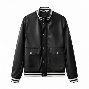 The Prestige Varsity PU Jacket blends iconic varsity attitude with Barocco’s elevated edge. Crafted with a smooth PU exterior and grounded by a cotton backing for comfort, it delivers a structured, premium feel without sacrificing ease of movement. Rib-knit striped cuffs and hem bring classic athletic detailing, while oversized flap pockets and polished snaps create a bold, modern silhouette. A statement outerwear piece built for standout street-lux styling.