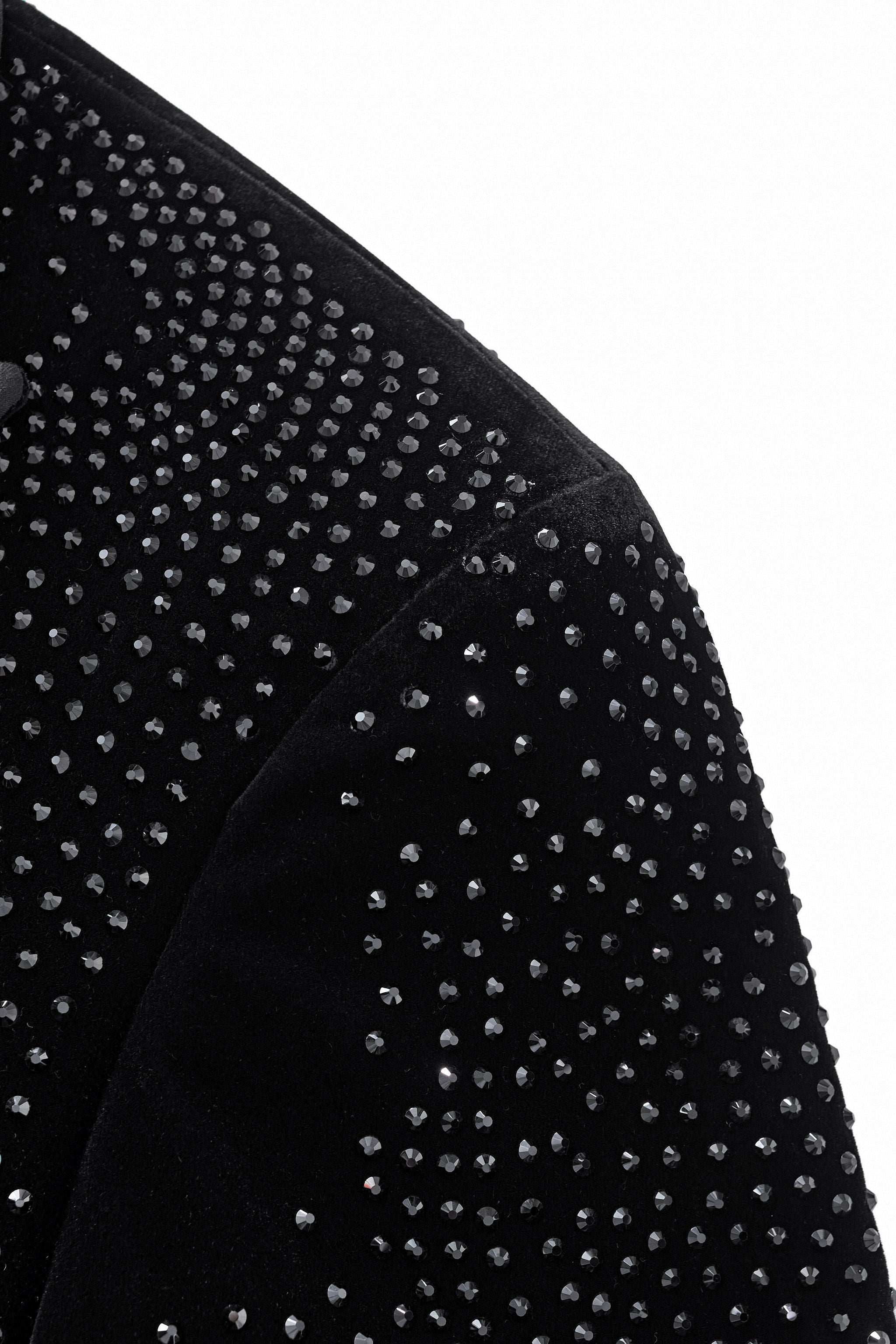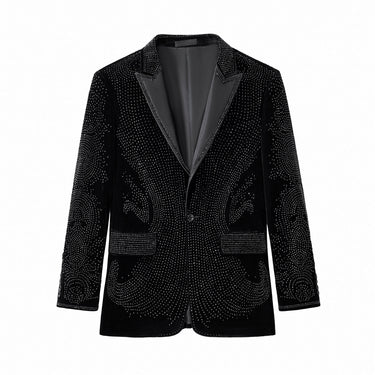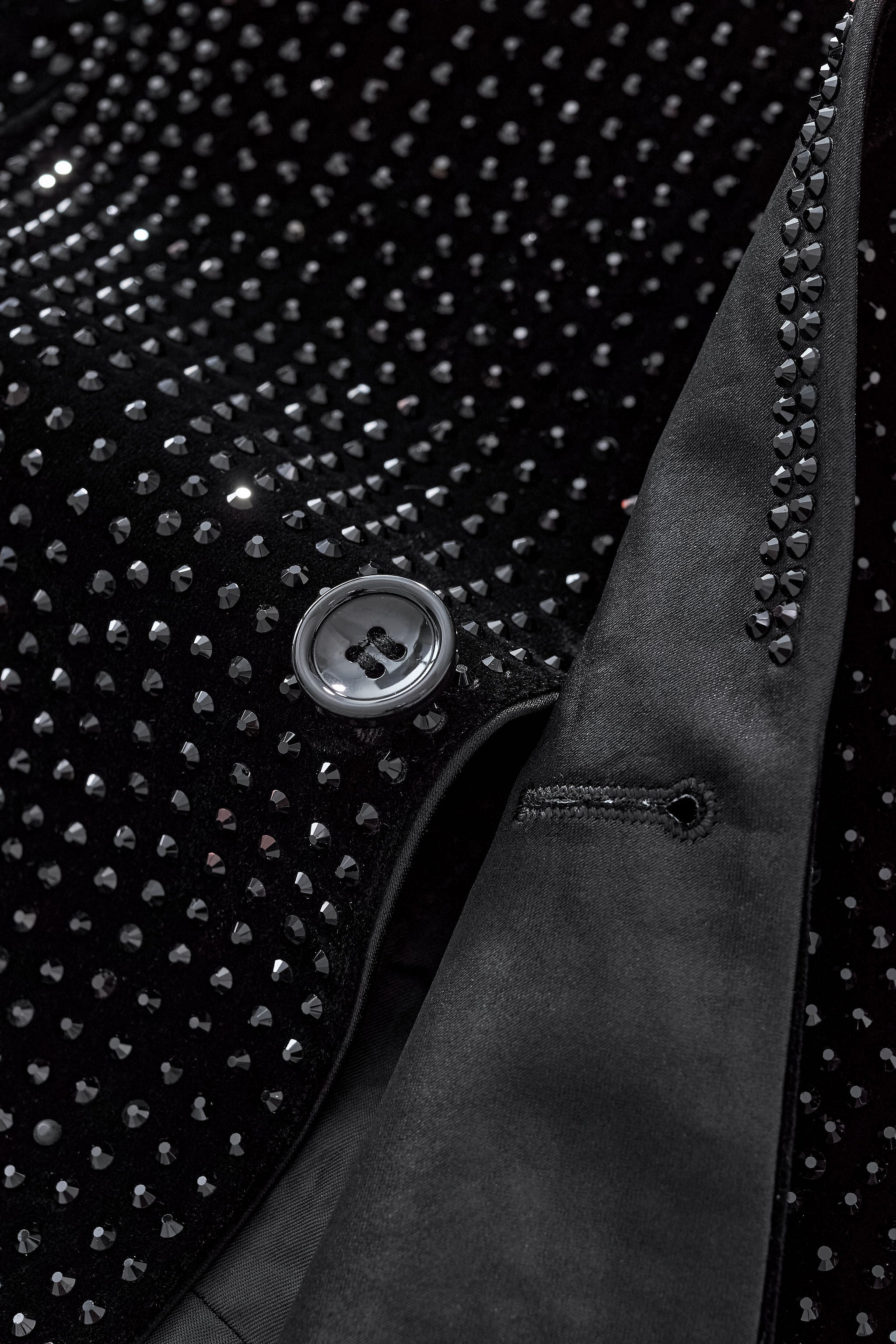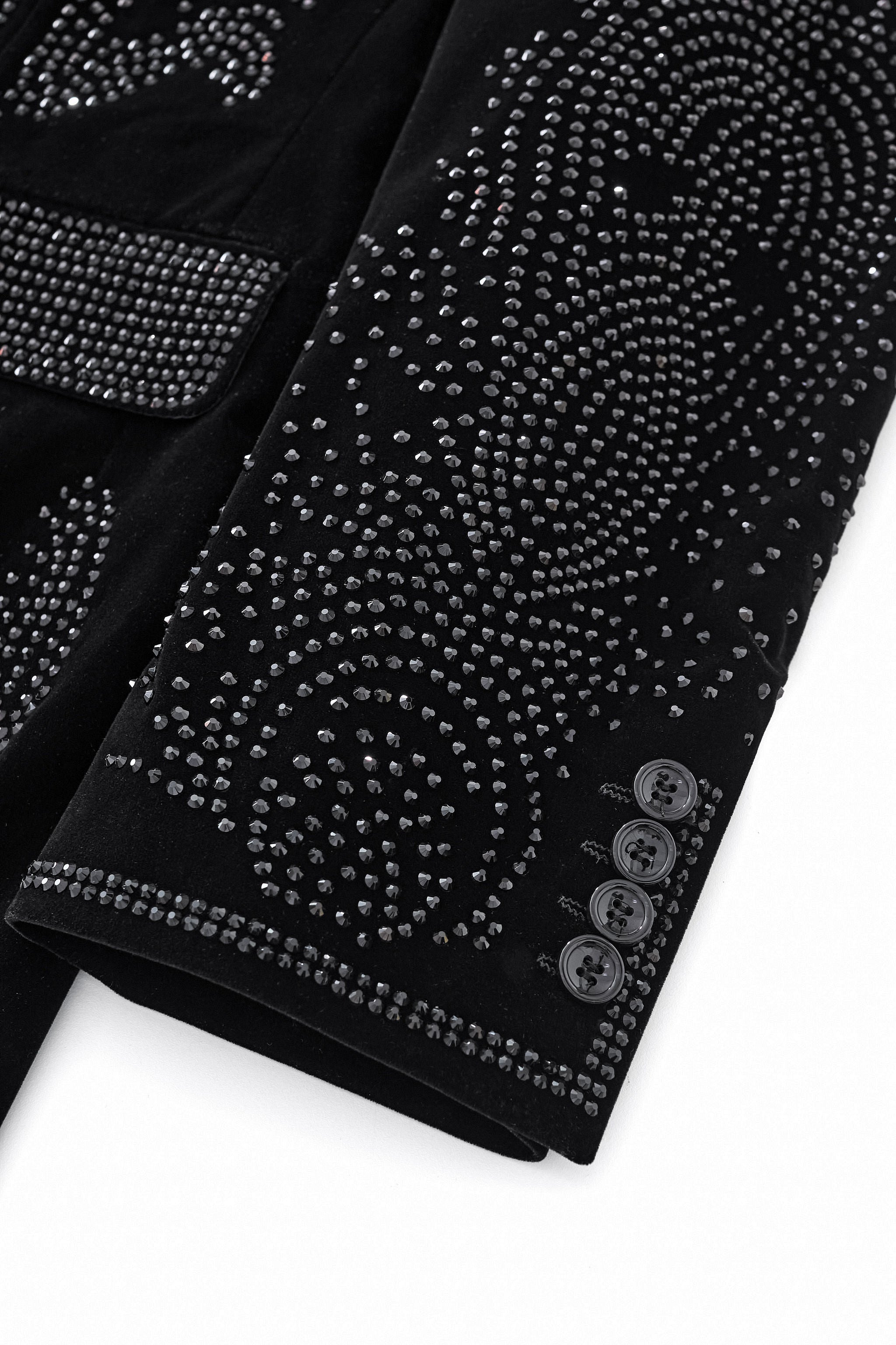 This blazer embodies Barocco’s signature statement luxury, merging intricate embellishment work with a sculpted, elevated silhouette. Thousands of precision-placed studs form sweeping cascade patterns across the front, sleeves, and back, creating dramatic dimension and a commanding visual presence. Its smooth velvet base and refined lapel detailing bring a distinguished finish suitable for high-end events, evening style, or any moment that calls for exceptional artistry.