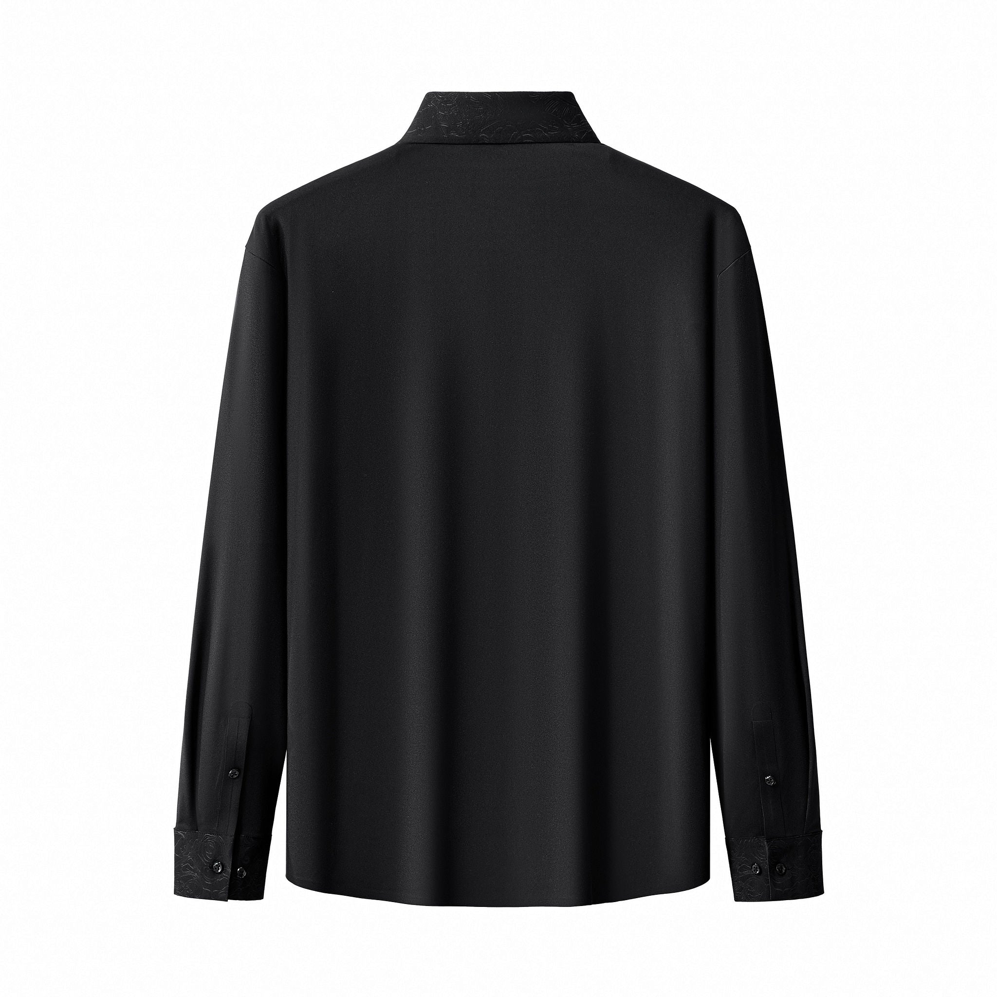 The Rose Éclat Emboss Shirt brings refined sophistication to the Barocco line with its tonal rose-embossed pattern woven directly into the fabric. The elevated floral detailing across the collar, shoulders, and cuffs creates a layered depth while maintaining a clean, minimal silhouette. The smooth nylon-spandex blend drapes effortlessly, offering a polished look suited for evenings out, special occasions, or elevated daily wear.