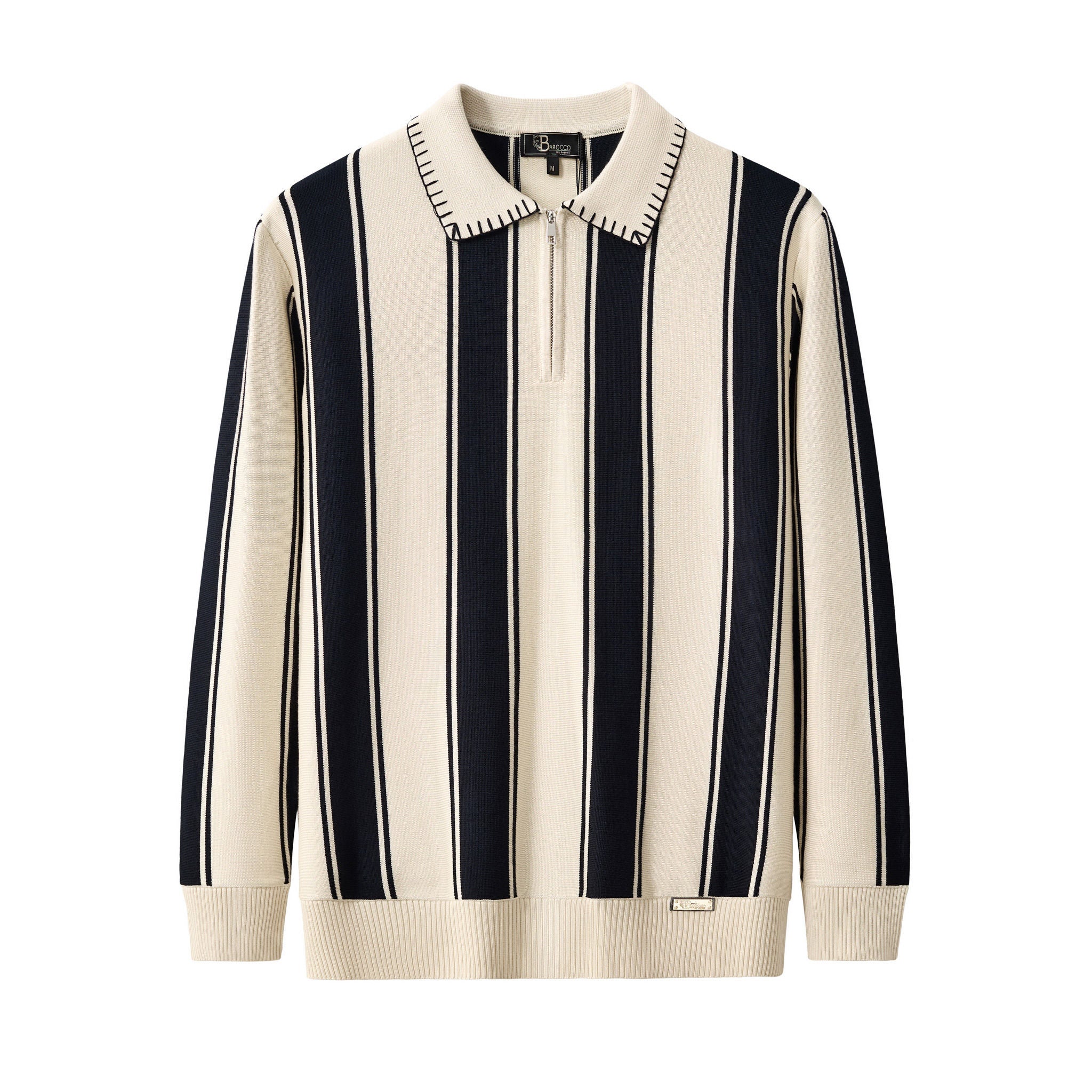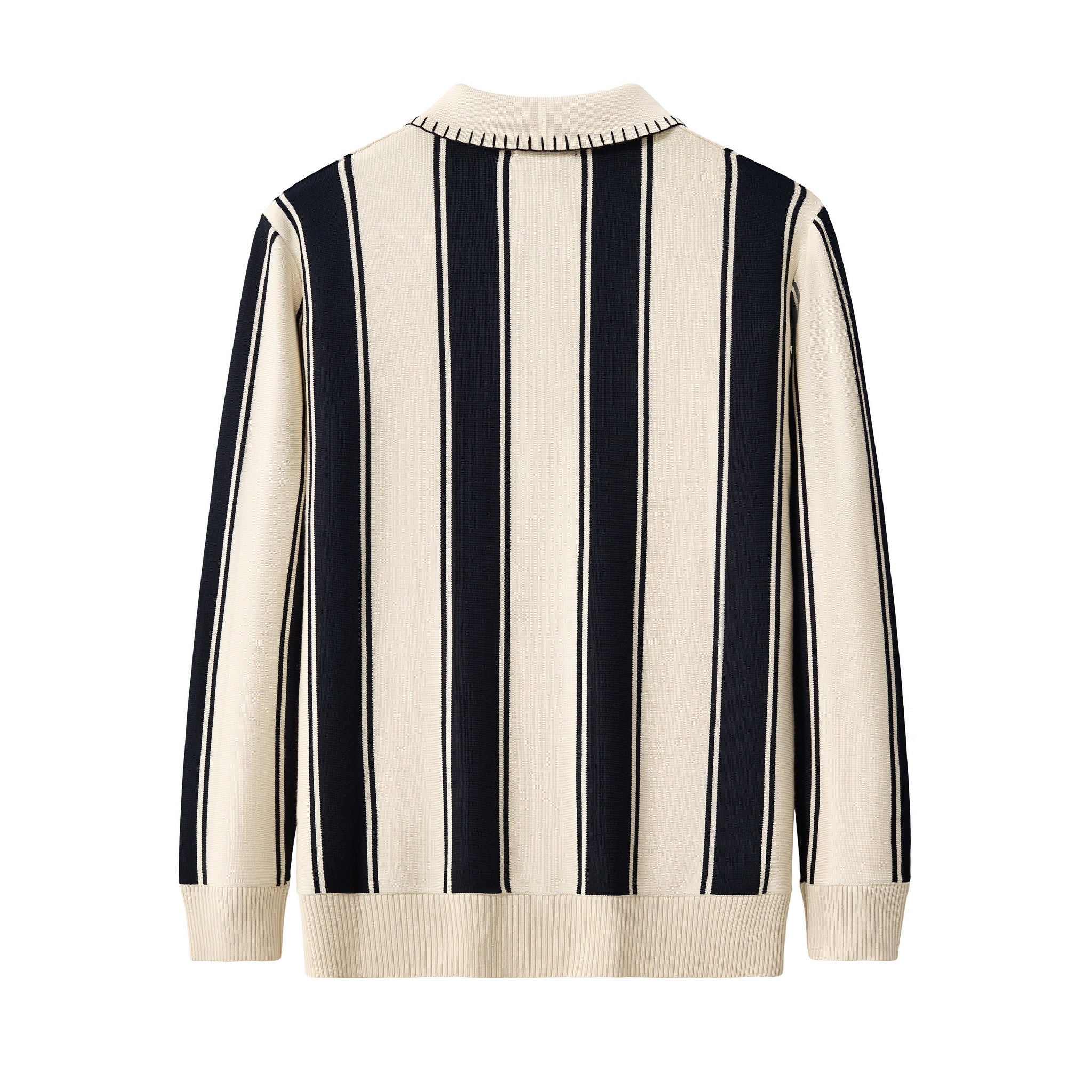 The Vanguard Stripe Knit Polo LS channels vintage sophistication through a modern lens. Crafted from a smooth viscose-blend knit, it features bold vertical stripes and contrast stitching along the collar for a refined statement. With its tailored drape and subtle sheen, this piece embodies Barocco’s signature fusion of timeless polish and contemporary edge.