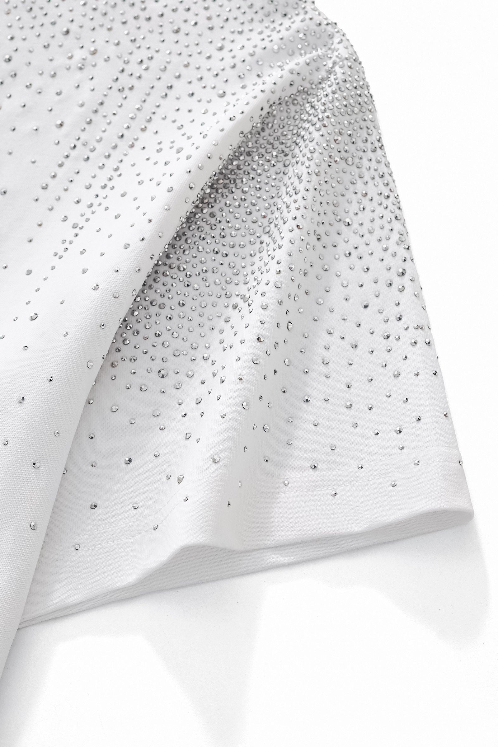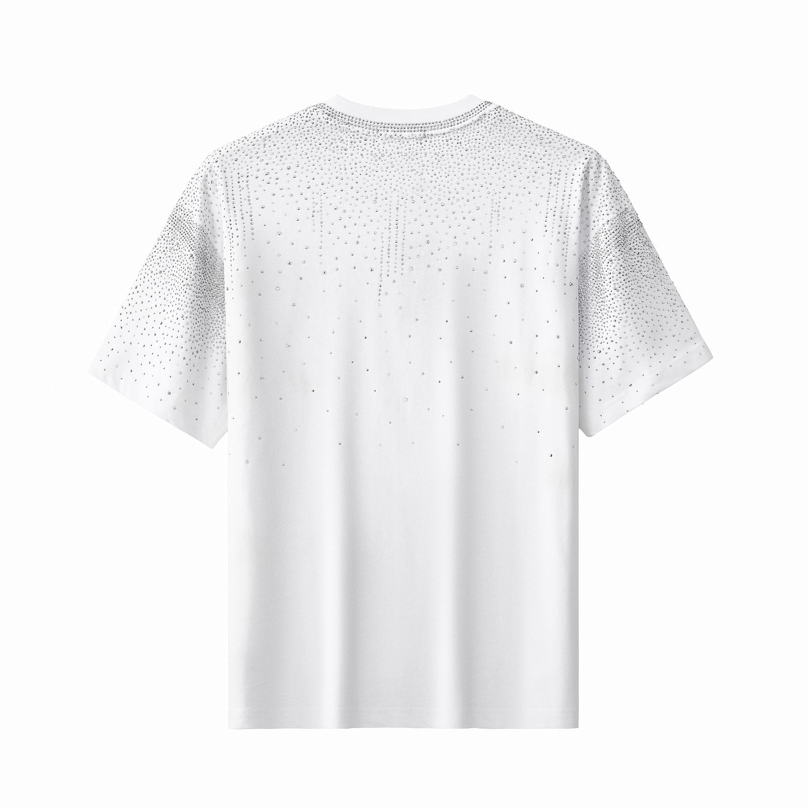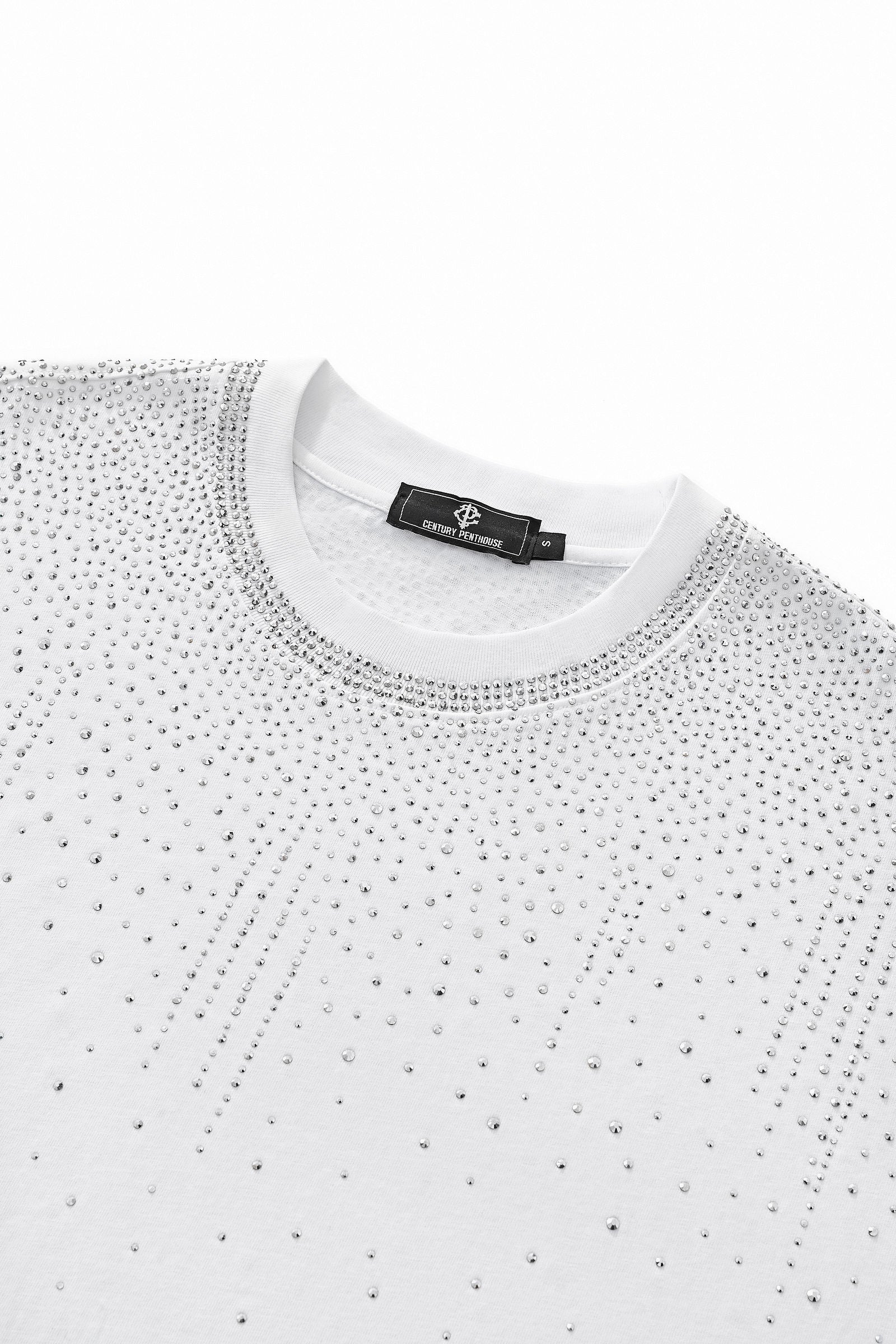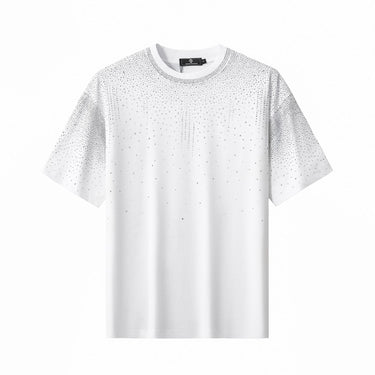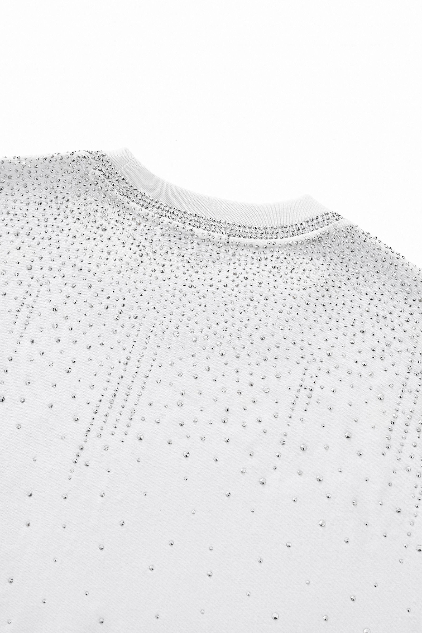 A refined short sleeve shirt designed with a modern, fashion-forward sensibility, featuring a clean silhouette accented by cascading stone embellishments across the shoulders and upper chest that deliver subtle brilliance and elevated statement appeal.