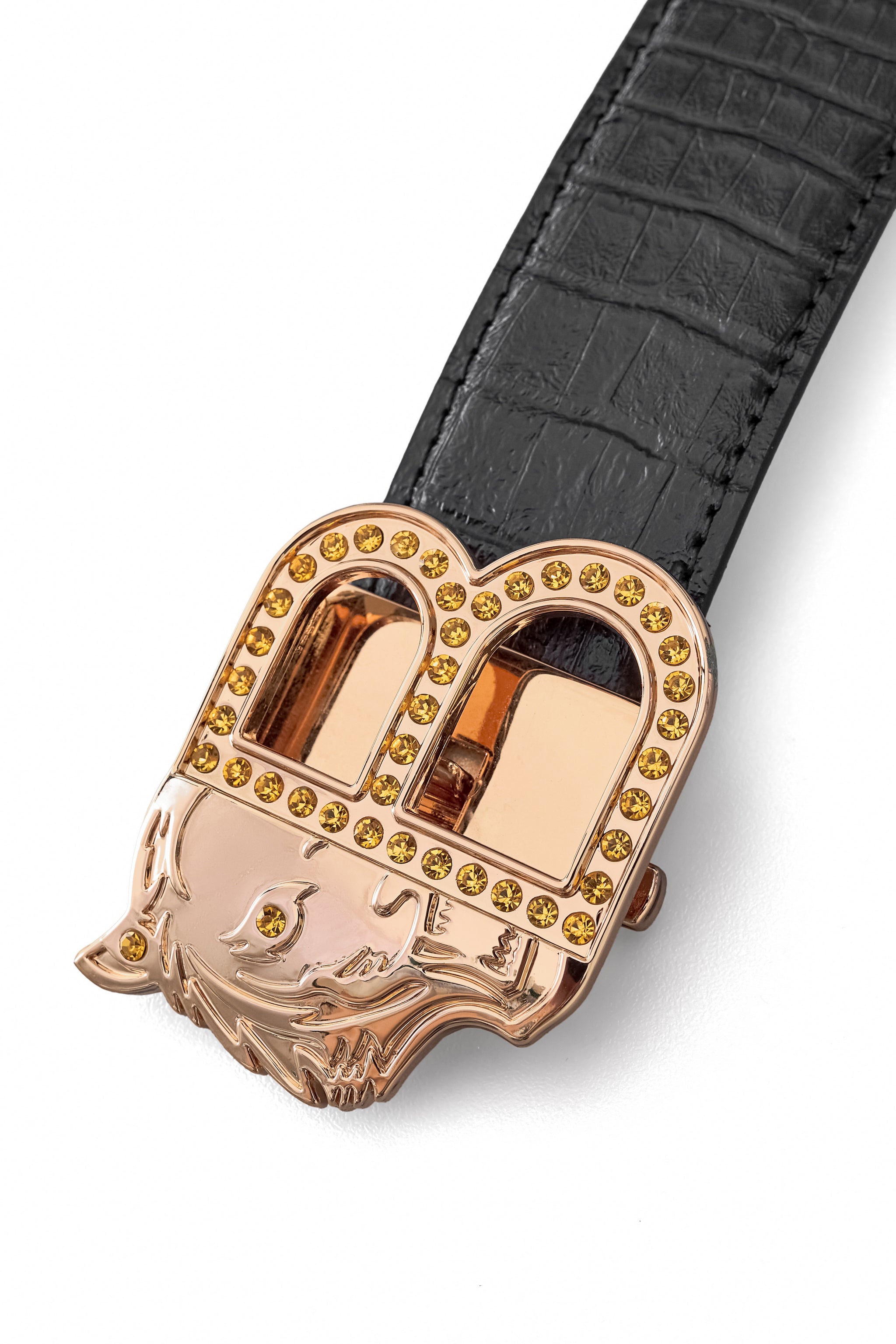 Automatic buckle closure in gold finish with decorative detailing