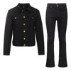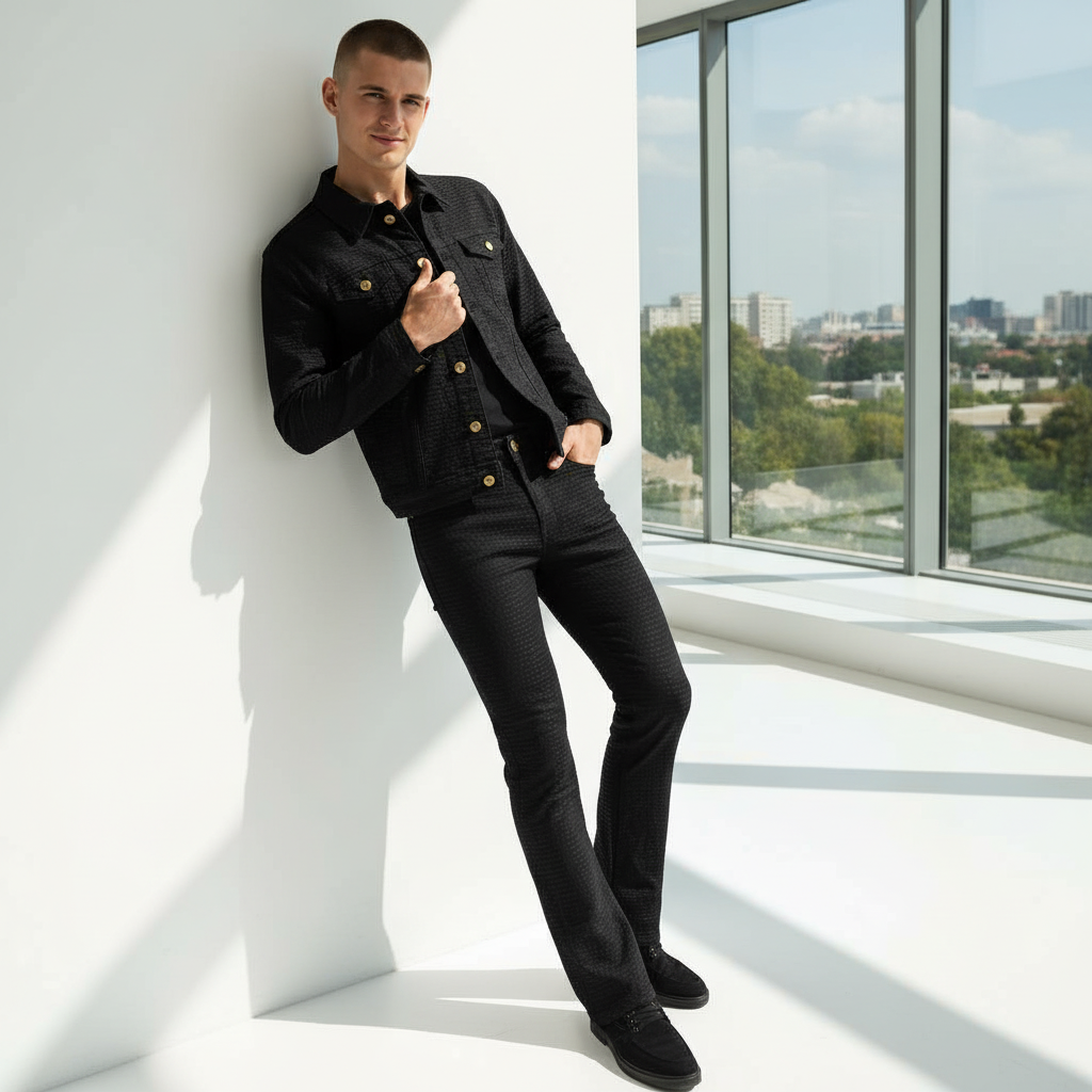 The Heritage Style Jacket is a long sleeve button-up jacket with a tailored structure. It is made from a cotton blend with stretch and finished in a textured fabric. Gold-tone embossed buttons add a refined detail. The jacket is designed for casual layering or polished everyday wear.