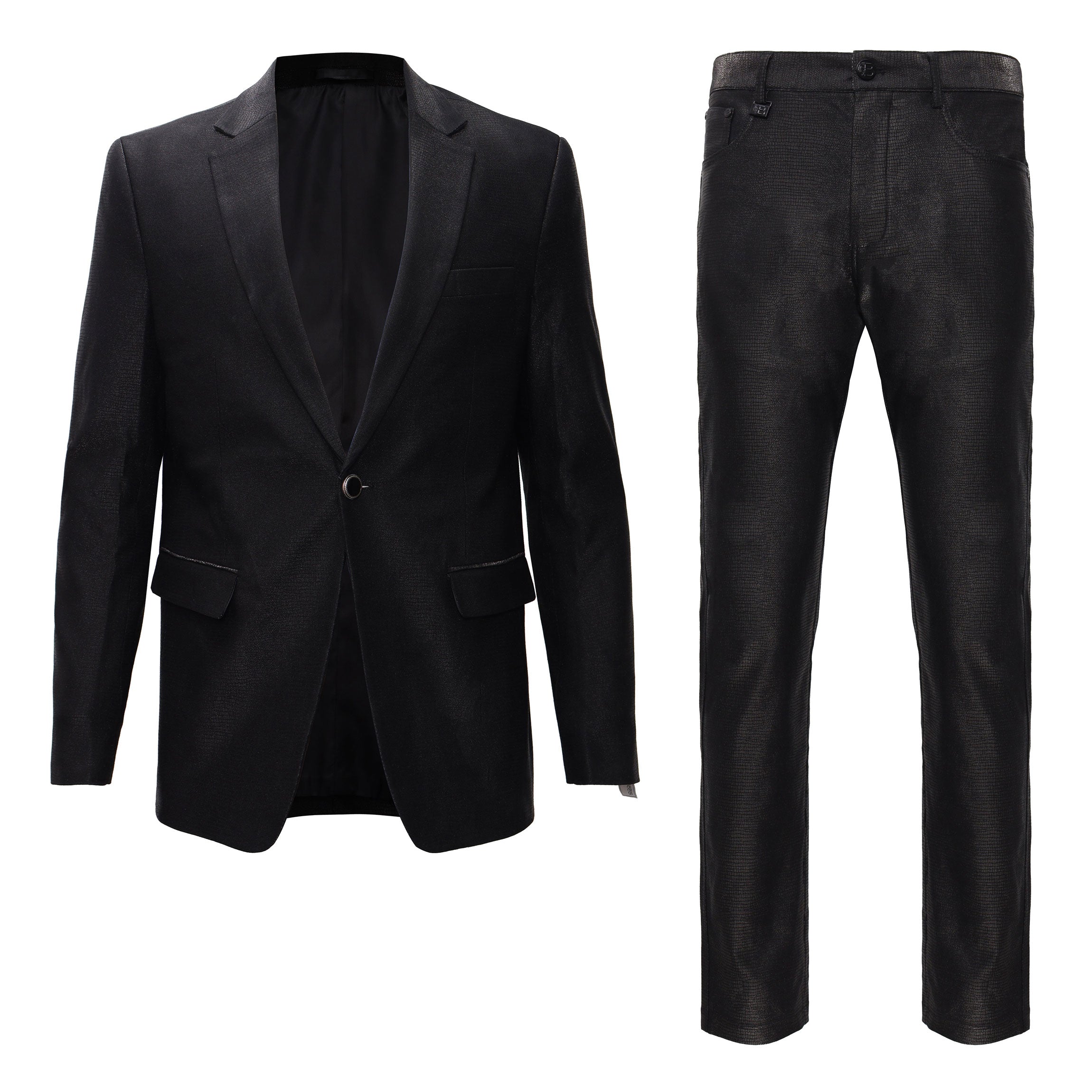 This set includes a slim-fit blazer and matching pants designed for dressy and smart-casual occasions. Both pieces feature a textured stretch fabric that adds structure while allowing ease of movement. The subtle metallic finish and tailored cuts create a polished, modern look suitable for day-to-night styling.