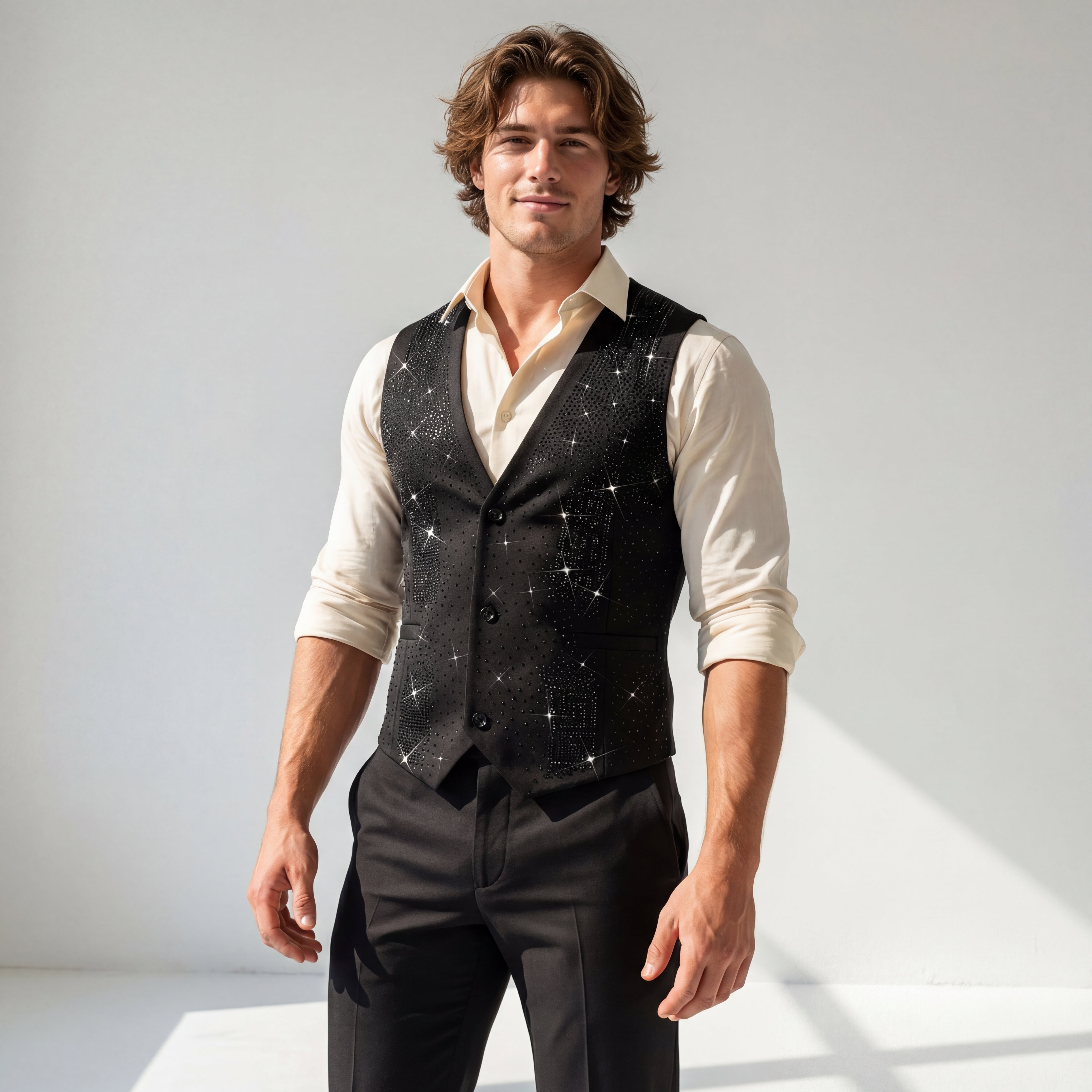 Make a striking entrance with the Luxe Luster Vest, a perfect fusion of premium tailoring and bold sophistication. Embellished with precision rhinestone patterns and sleek geometric designs, this vest embodies refined luxury with a modern edge. Its sharp silhouette and versatile styling options make it an essential layer for formal occasions or upscale nights out.
