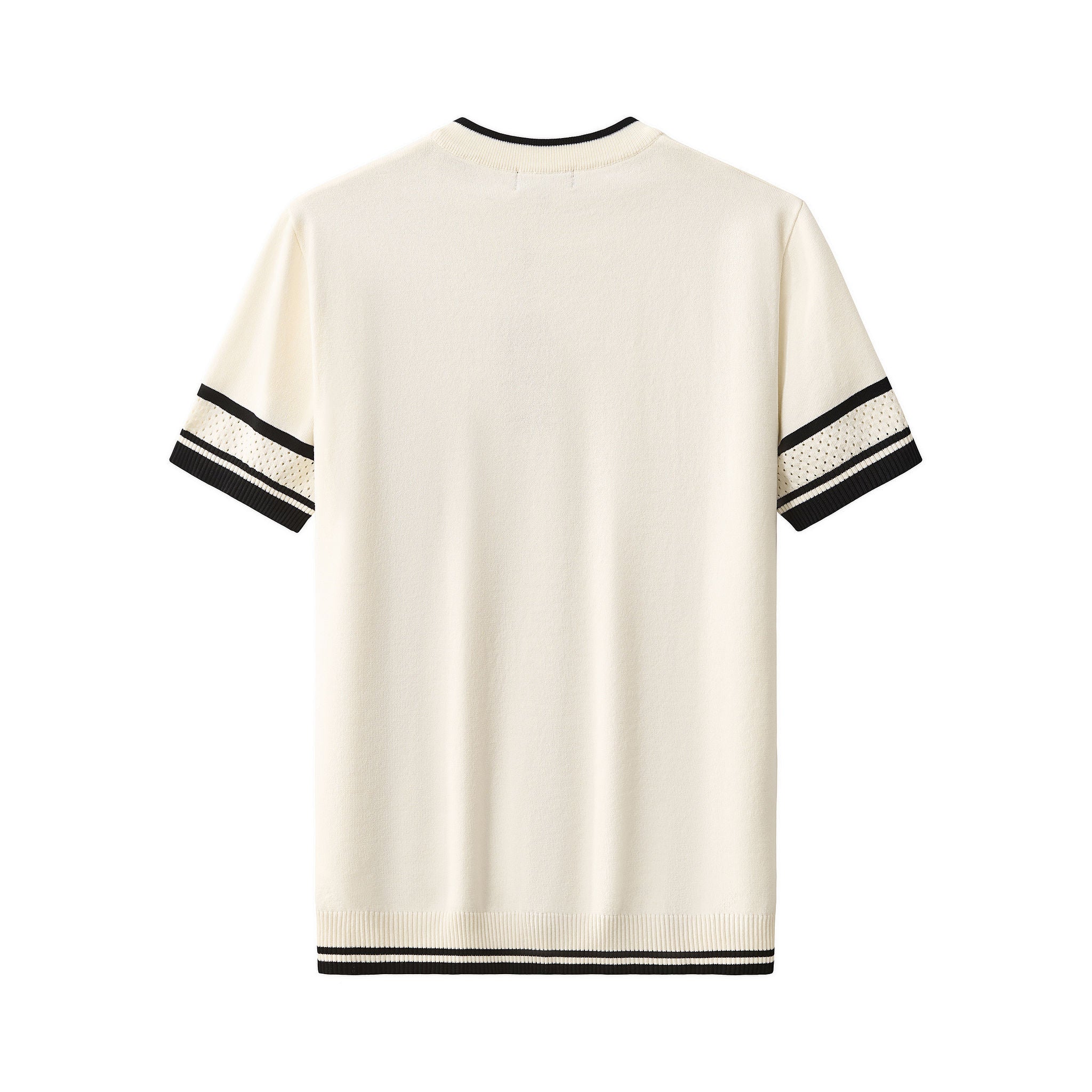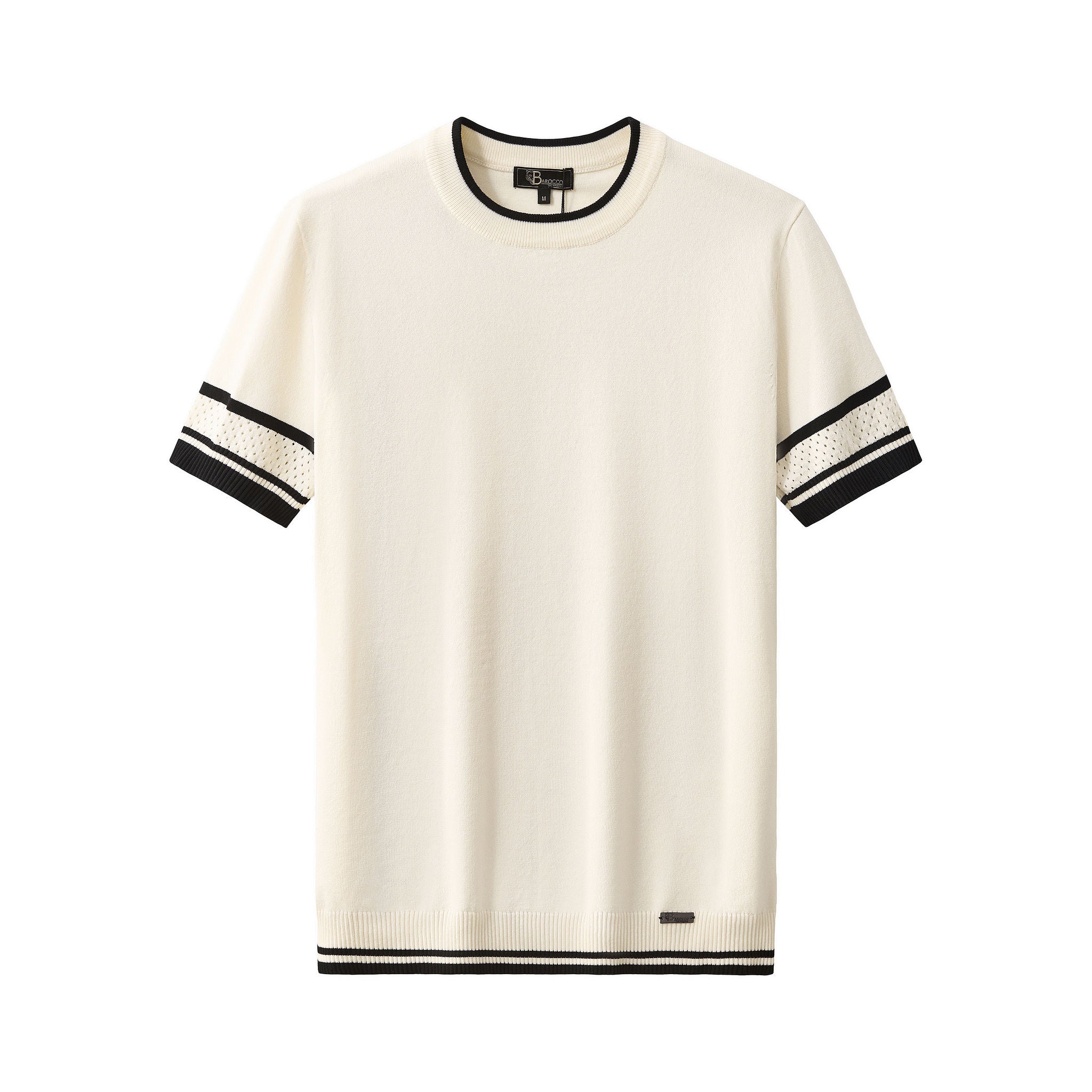A refined short sleeve knit tee designed with a clean, modern sensibility, featuring a smooth lightweight knit body accented by contrast athletic-inspired trim and subtle mesh sleeve paneling that delivers a polished yet relaxed luxury look.