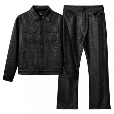 A fashion-forward coordinated set designed as a complete statement, defined by a structured trucker-inspired silhouette and refined texture that delivers bold presence and modern confidence when worn together as a unified look. This set is sold as a paired jacket and pant due to production packaging and is available in the following size combinations: S/30, M/32, L/34, XL/36, XXL/38, 3X/40, 4X/42.