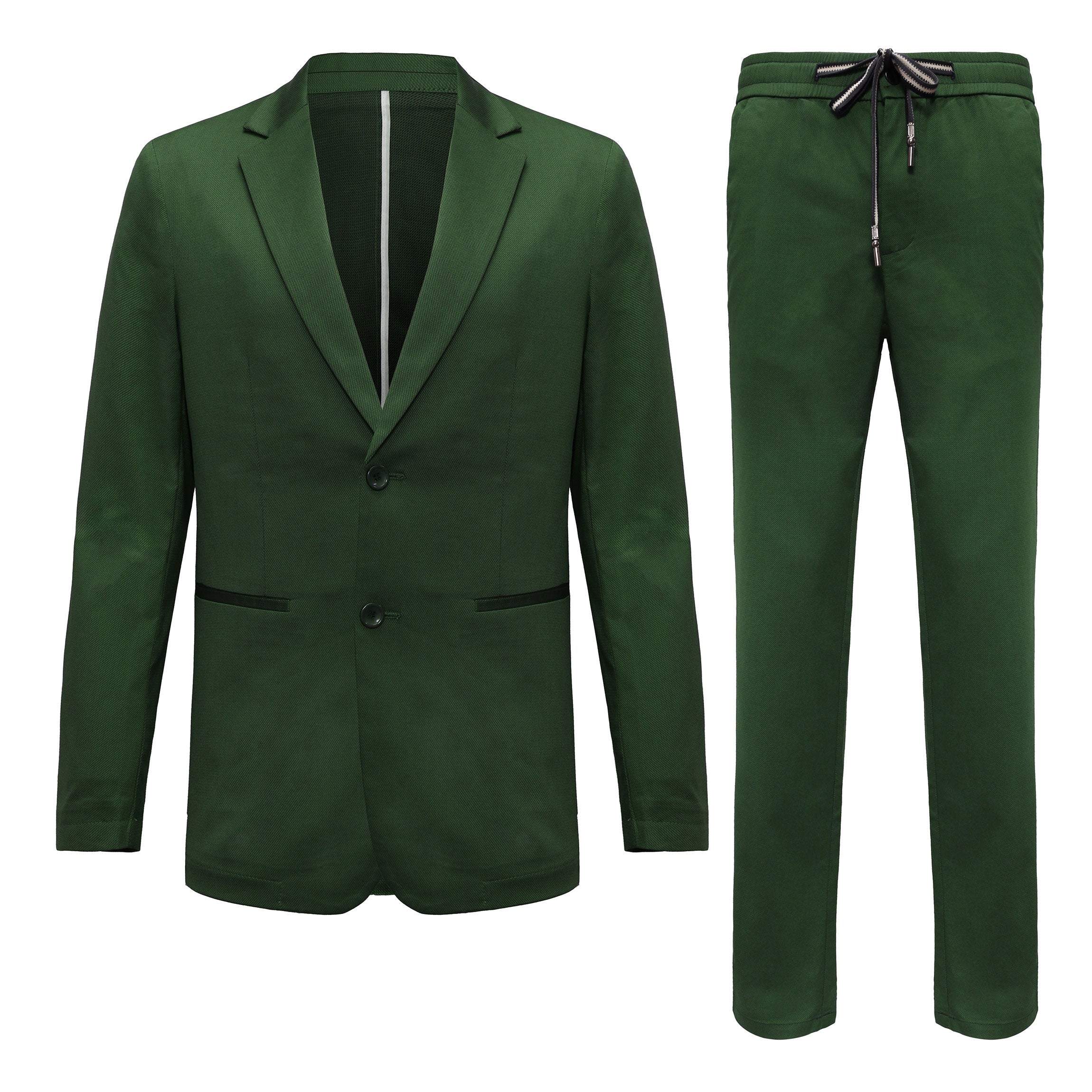Both blazer and pants are tailored for a polished appearance. Pants feature an adjustable drawstring waist for customizable comfort.