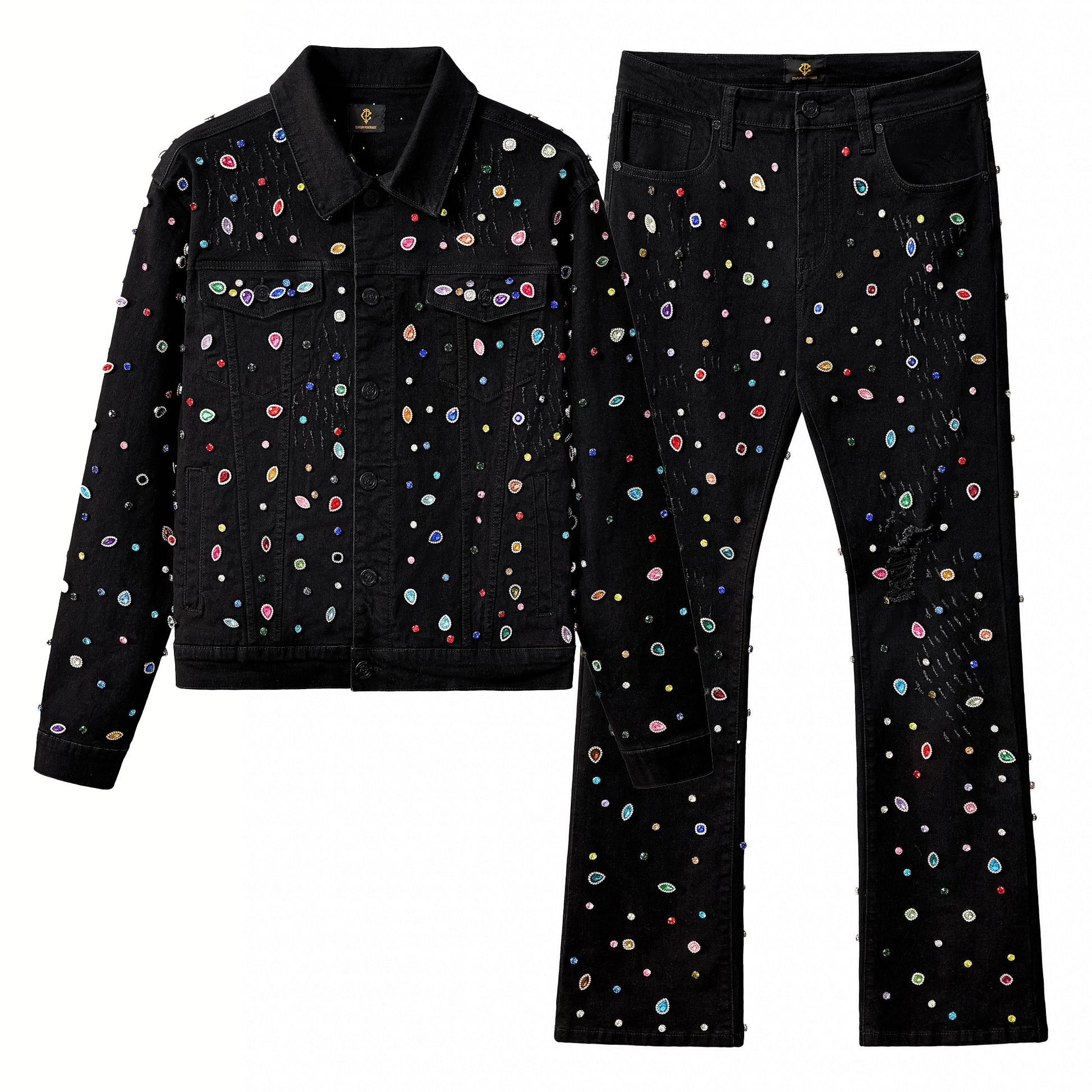 This denim jacket and pant set features multicolor gem embellishments on black stretch denim. The jacket and pants share a scattered gem pattern for a coordinated look. Both pieces are cut with a clean, tailored structure. Intended for styled wear and statement outfits.
