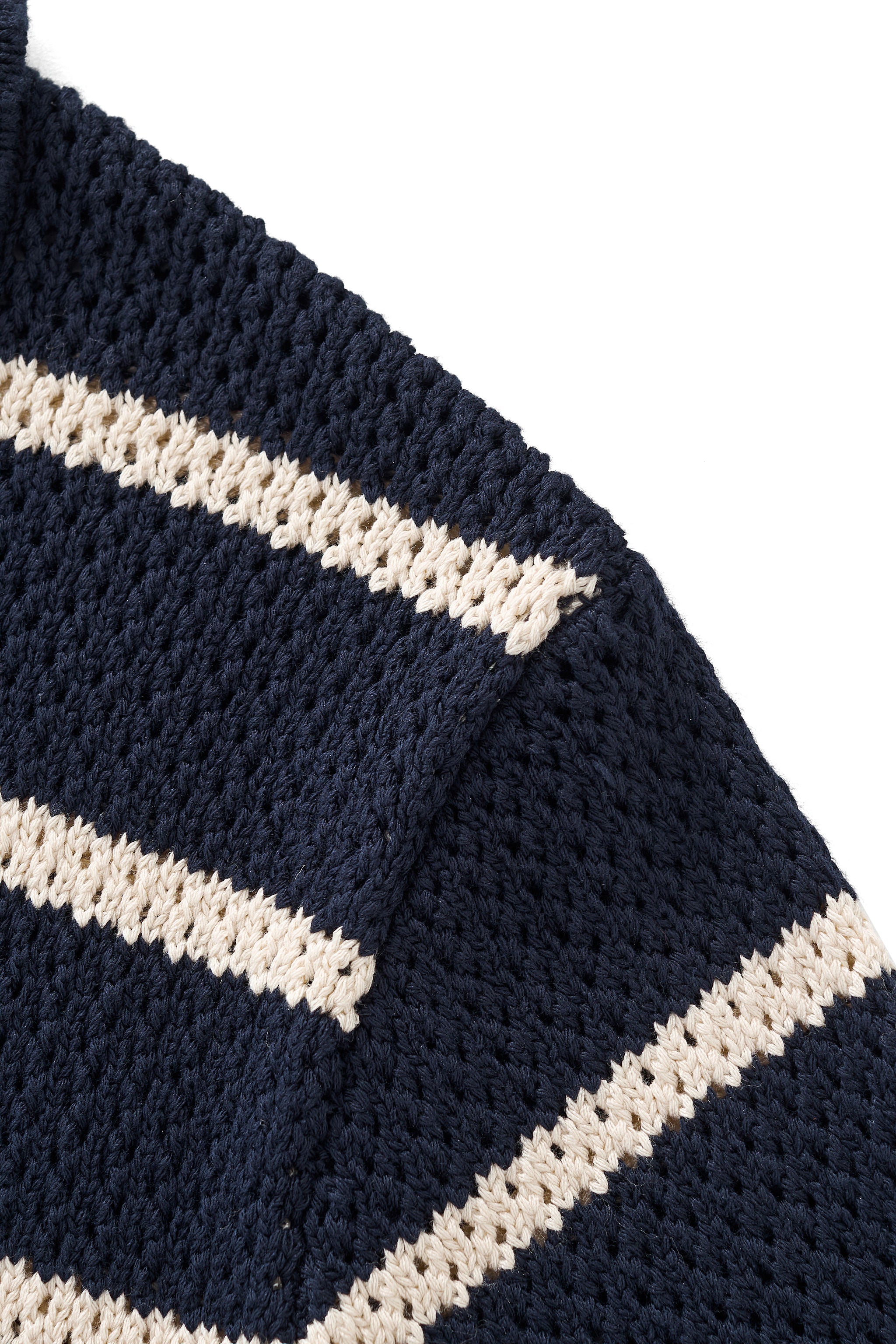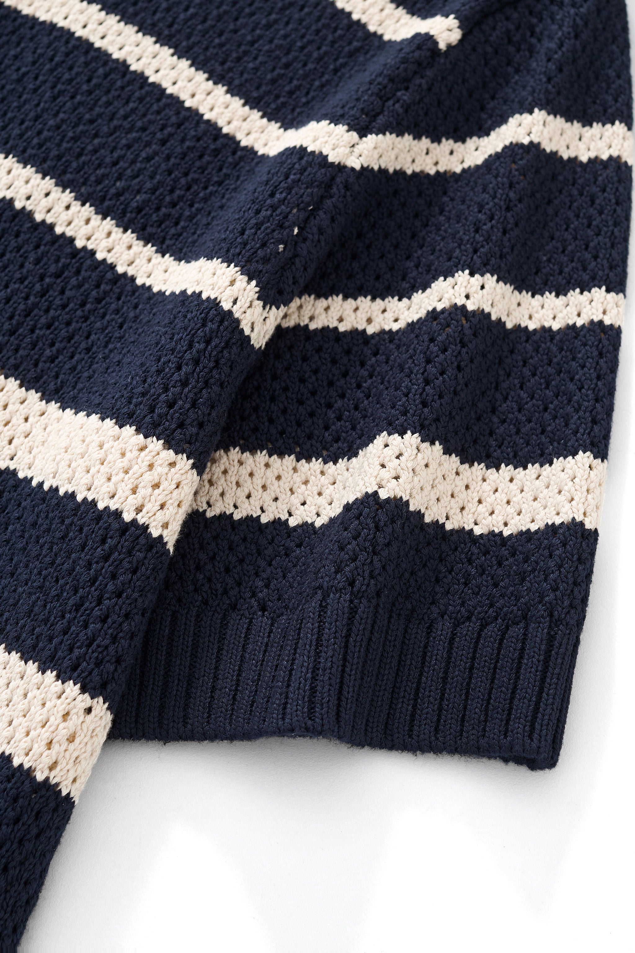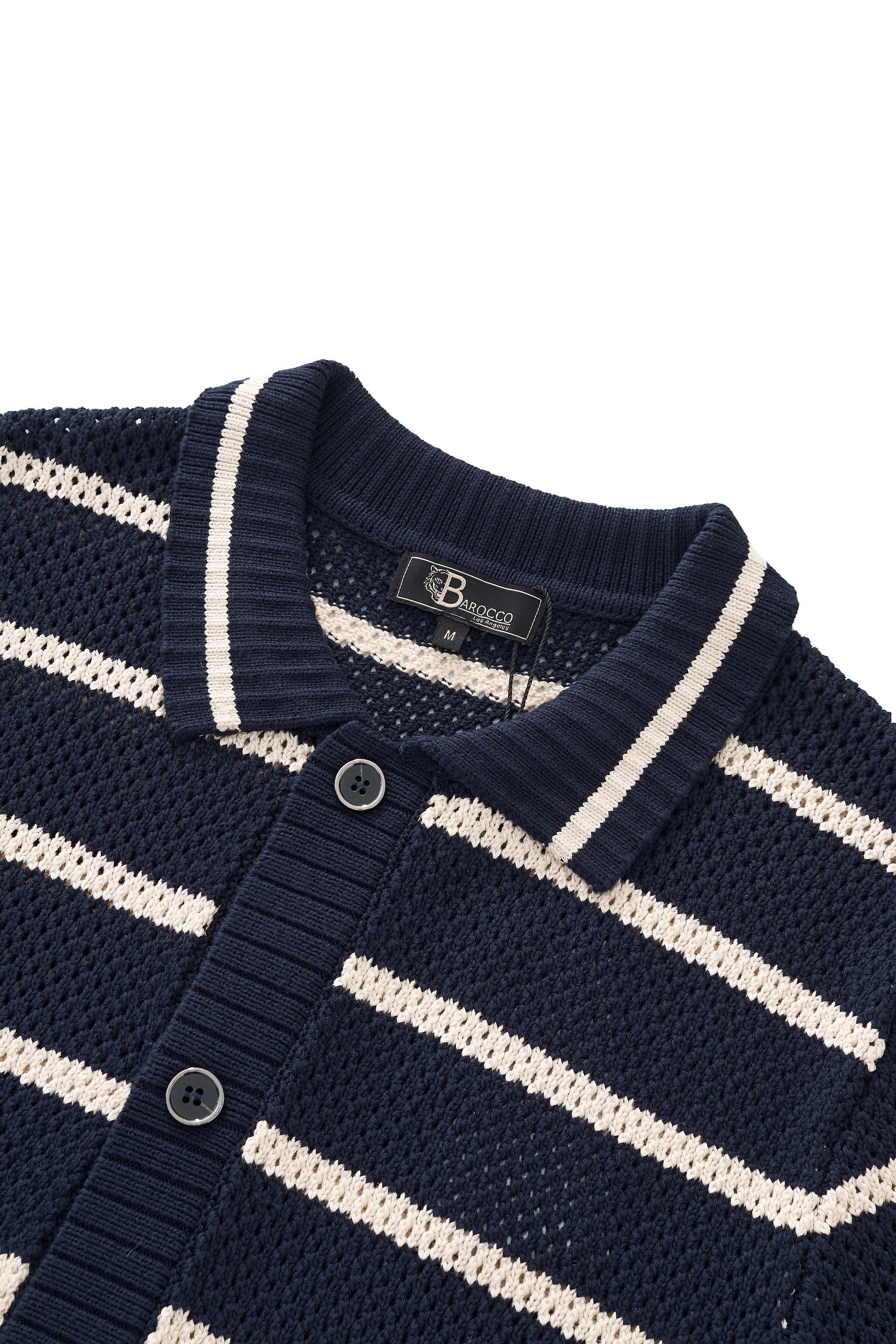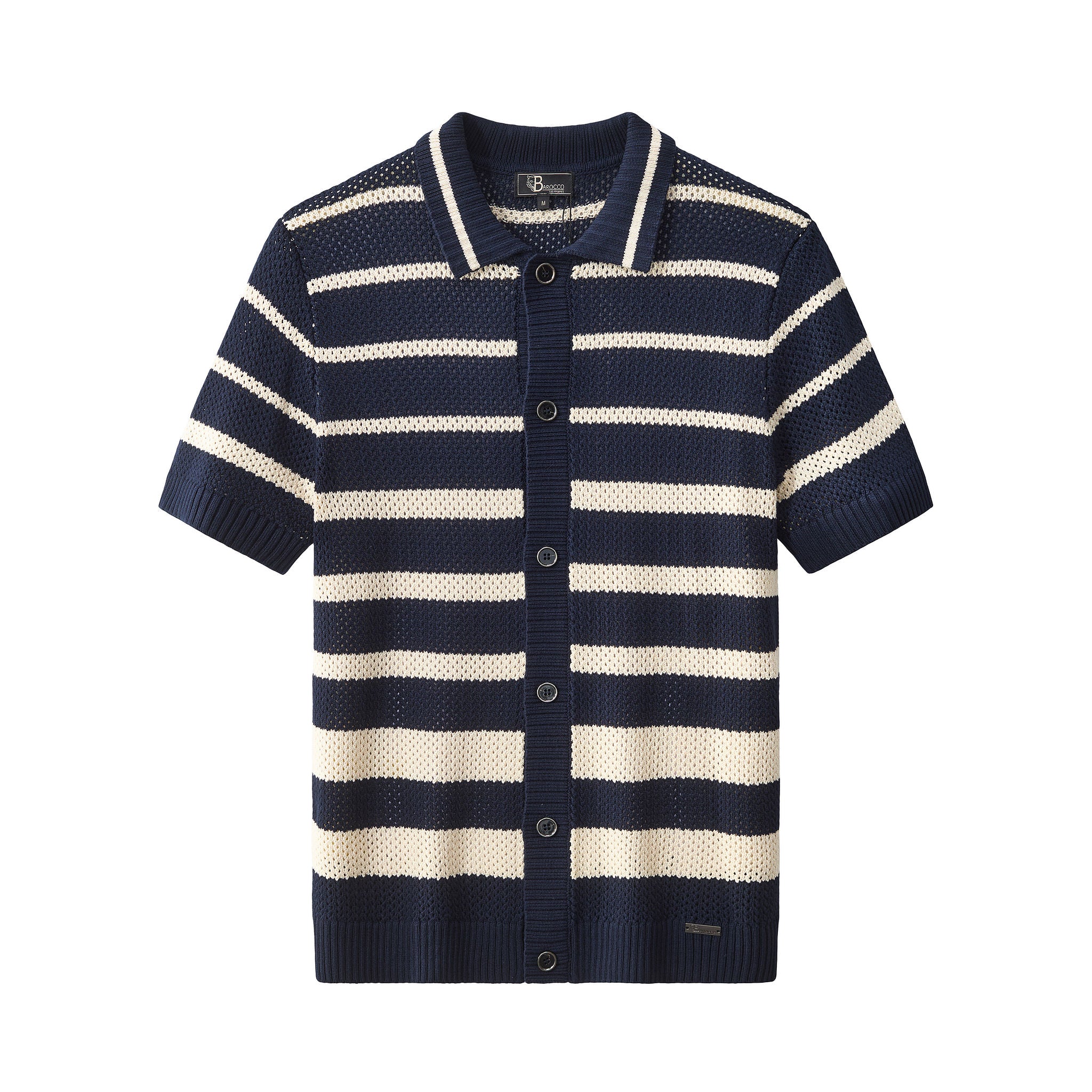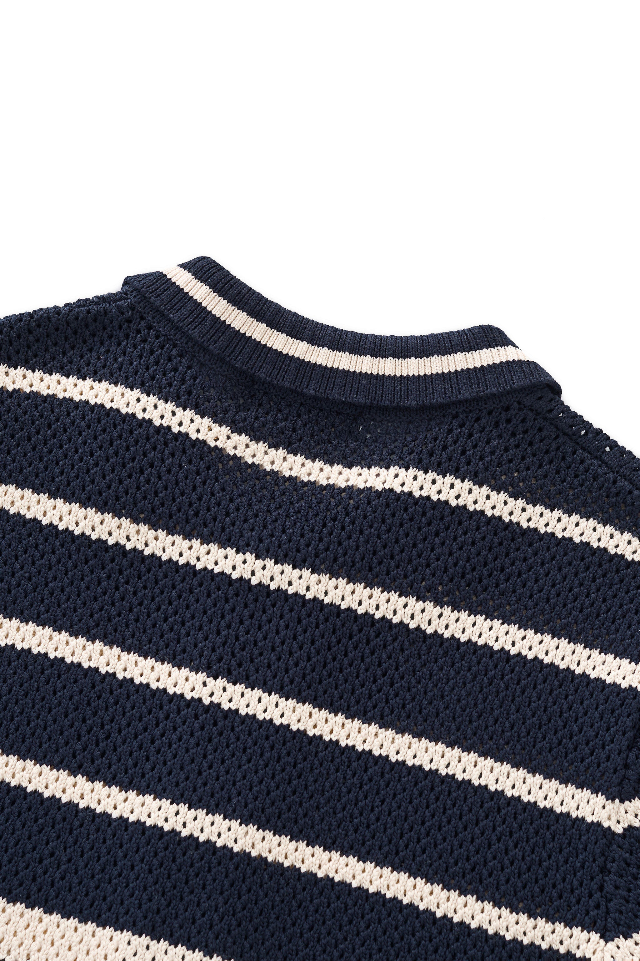 A refined short sleeve knit shirt designed with a relaxed, fashion-forward sensibility, featuring a breathable mesh knit construction accented by bold nautical-inspired stripe detailing that delivers lightweight comfort and an elevated warm-weather look.