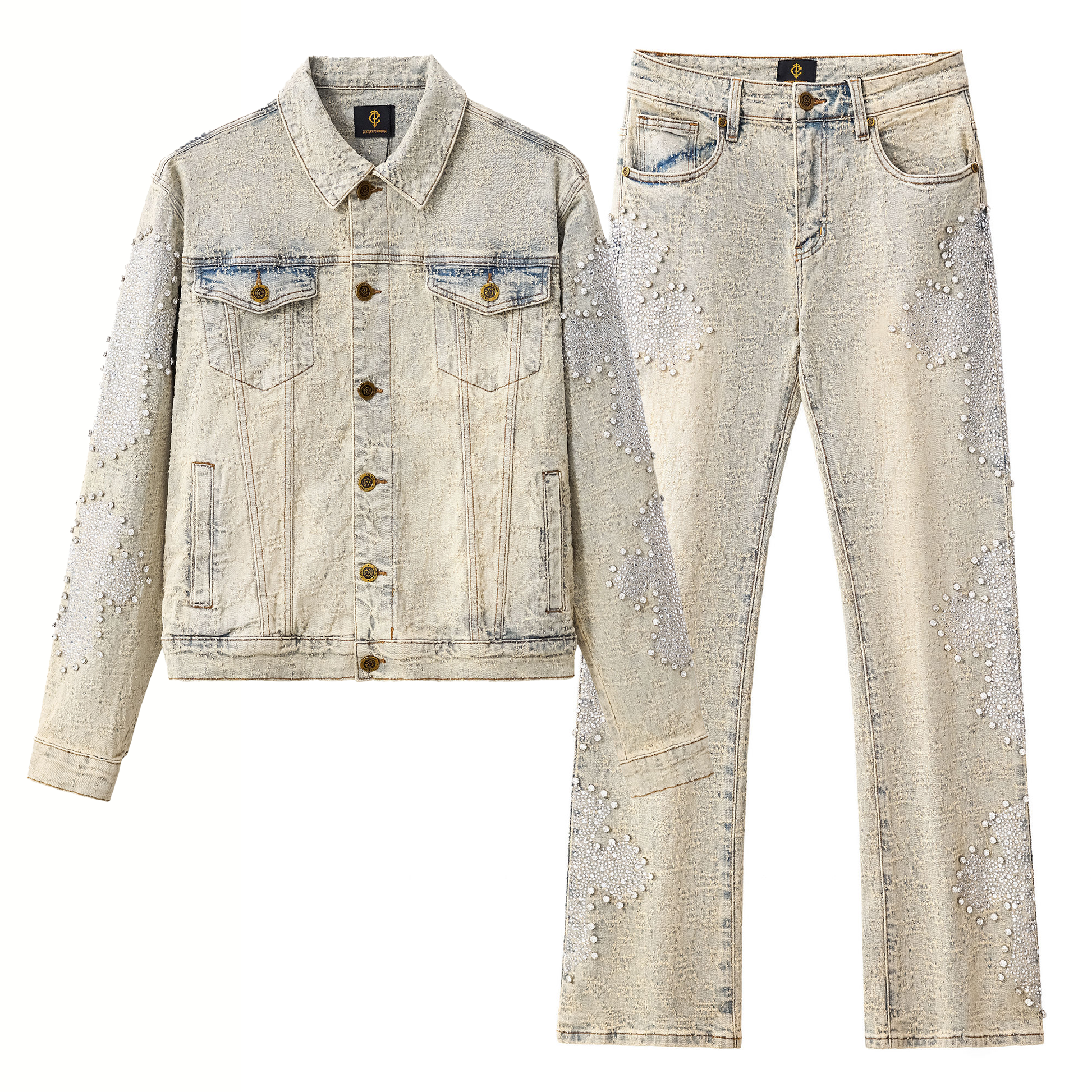 This denim jacket and pant set features coordinated bead detailing and structured tailoring. The jacket includes a dimensional cross motif on the back with embellishments on the sleeves. The pants are designed to match with subtle bead accents and a clean finish. Intended for coordinated wear in styled and street-inspired outfits.