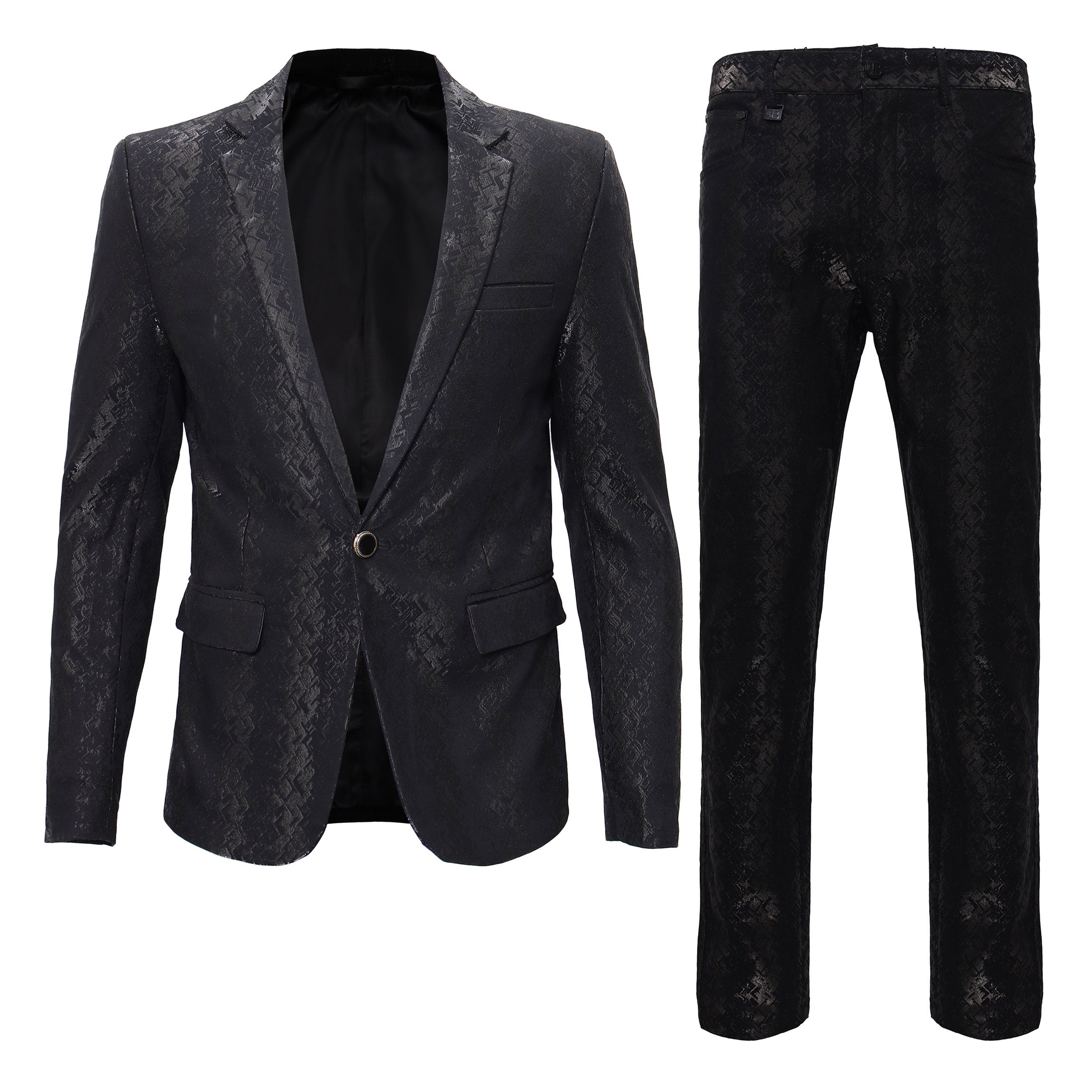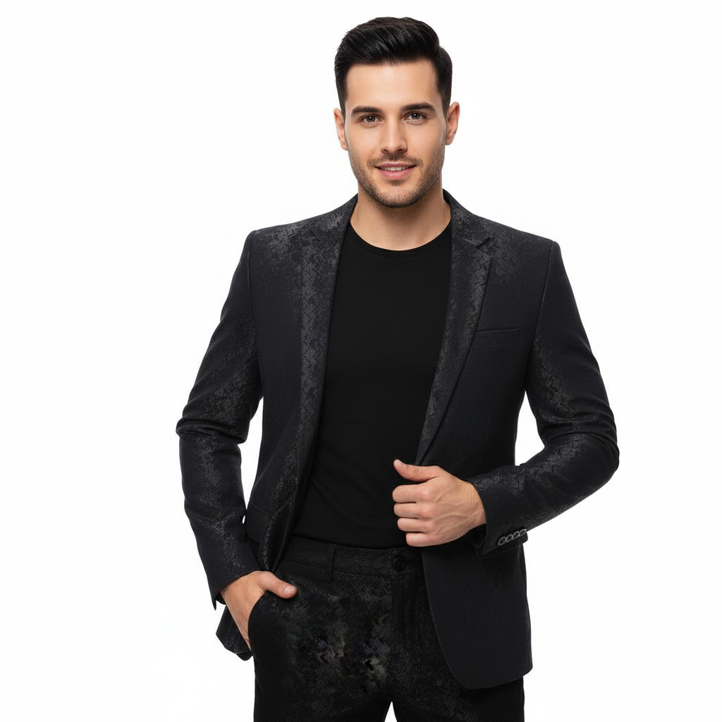 This coordinated blazer and pant set is designed for formal and elevated occasions. It features a structured silhouette with a clean, tailored appearance. The textured fabric adds visual depth while maintaining a refined look. Stretch in the material supports comfort during extended wear. The set is suitable for business settings, evening events, and formal gatherings.
