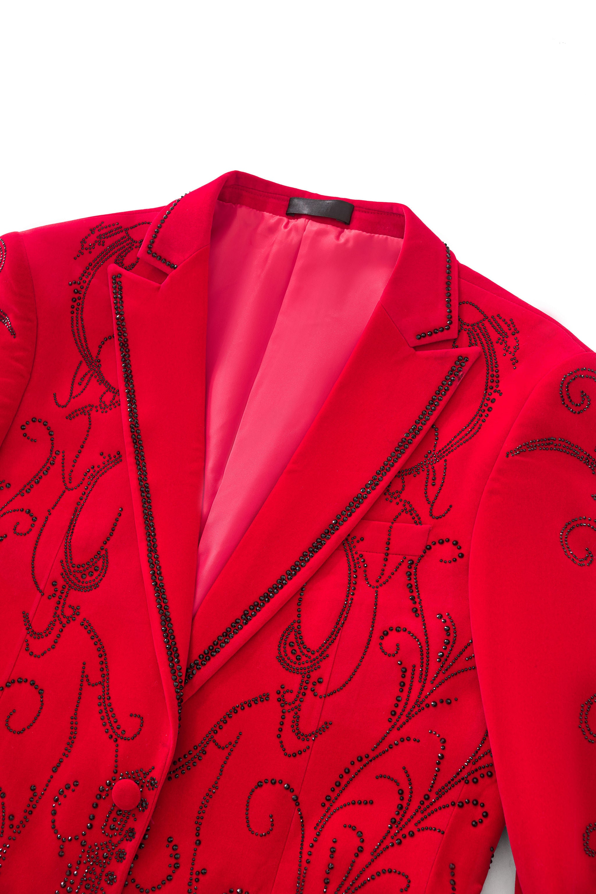 The Valent Velvet Blazer embodies opulent sophistication with its deep velvet base and intricate tonal scrollwork. Satin peak lapels and pocket detailing heighten the contrast, while its precision tailoring creates a sculpted, modern silhouette. Designed for evening affairs and bold statements, it captures Barocco’s signature fusion of luxury and edge.