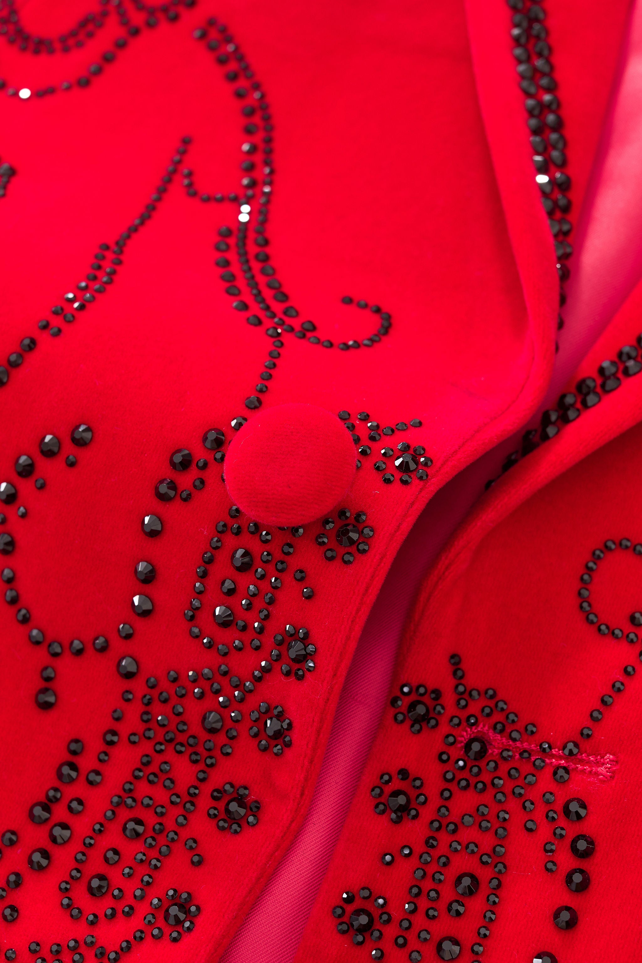 - Tailored velvet blazer with single-button closure