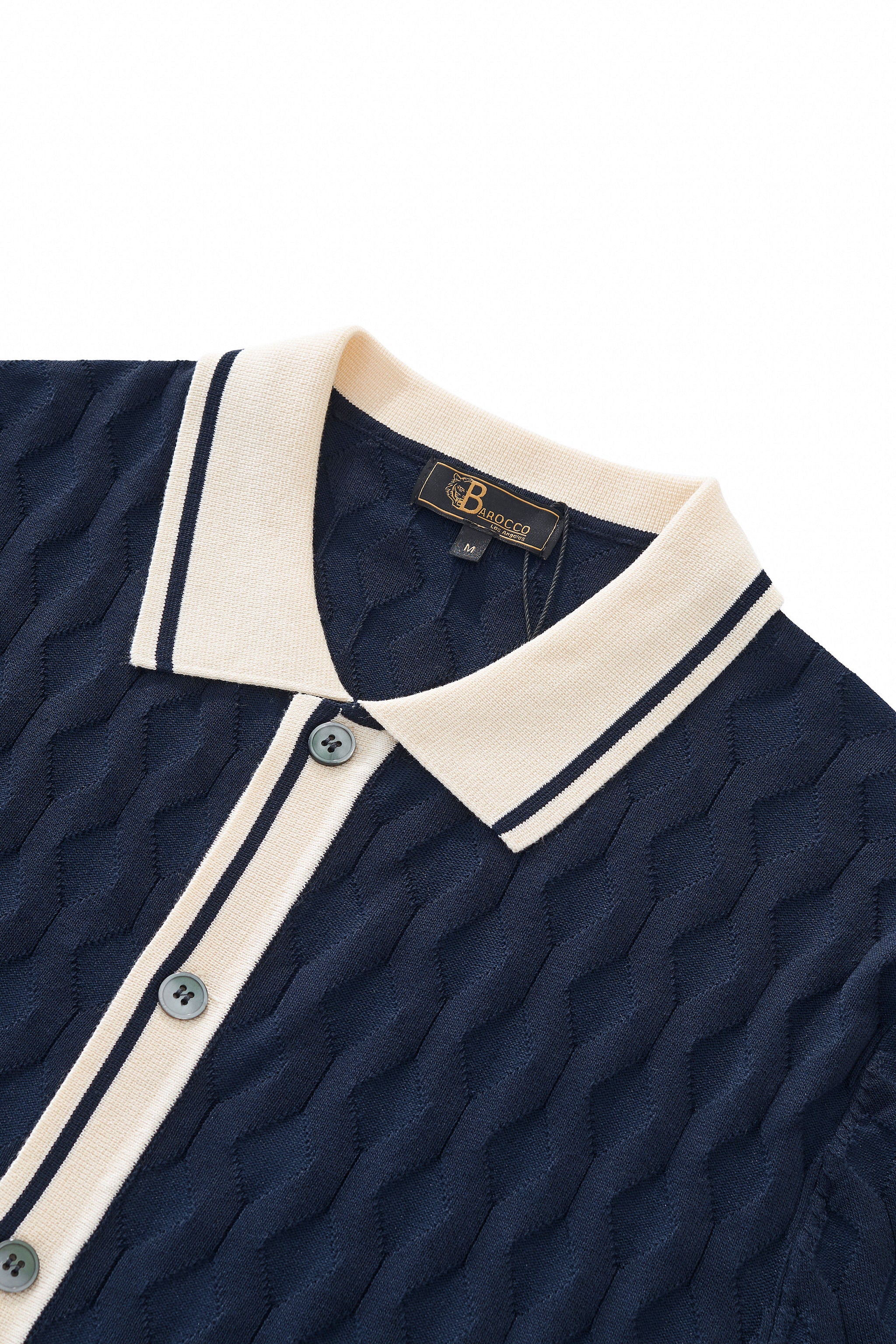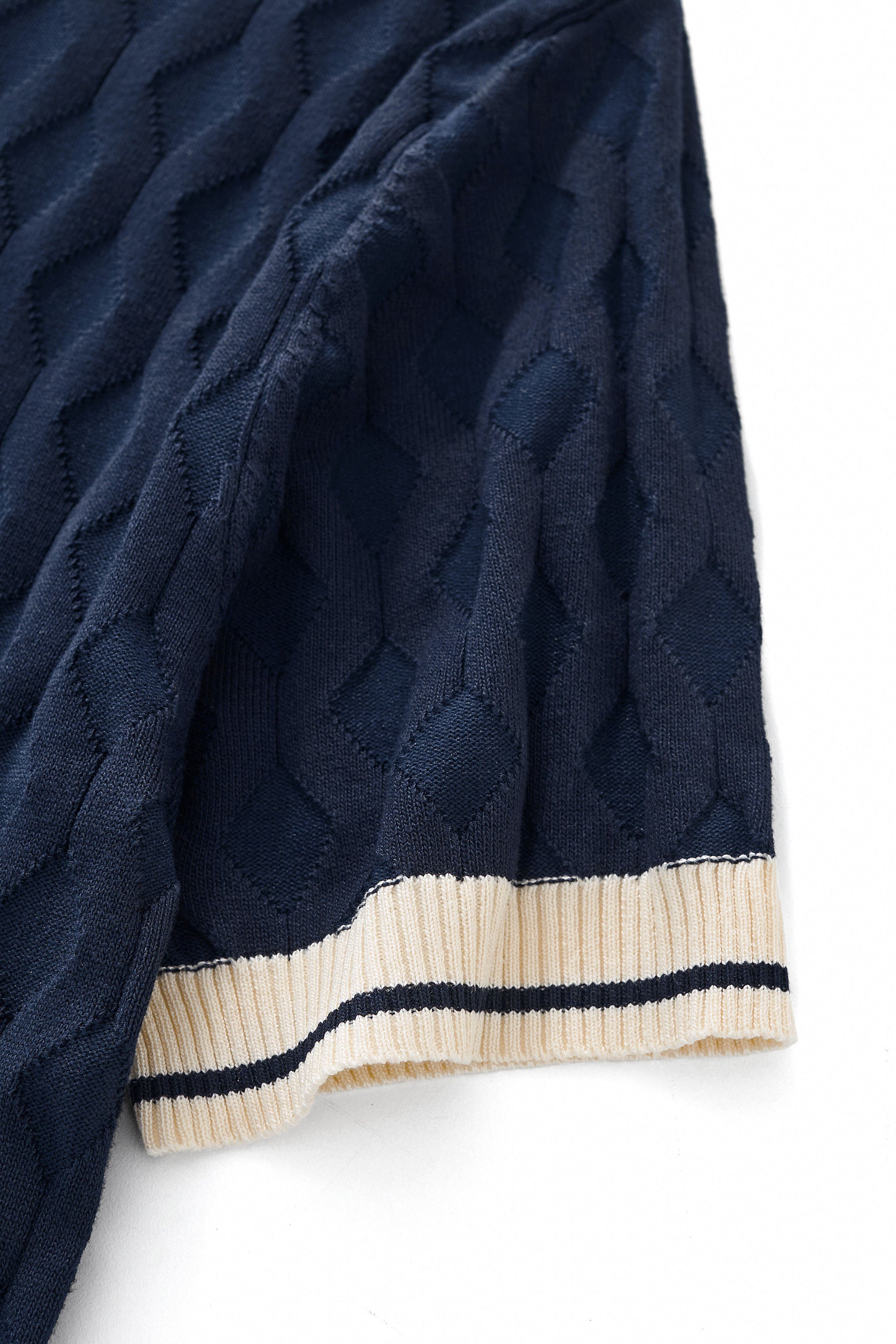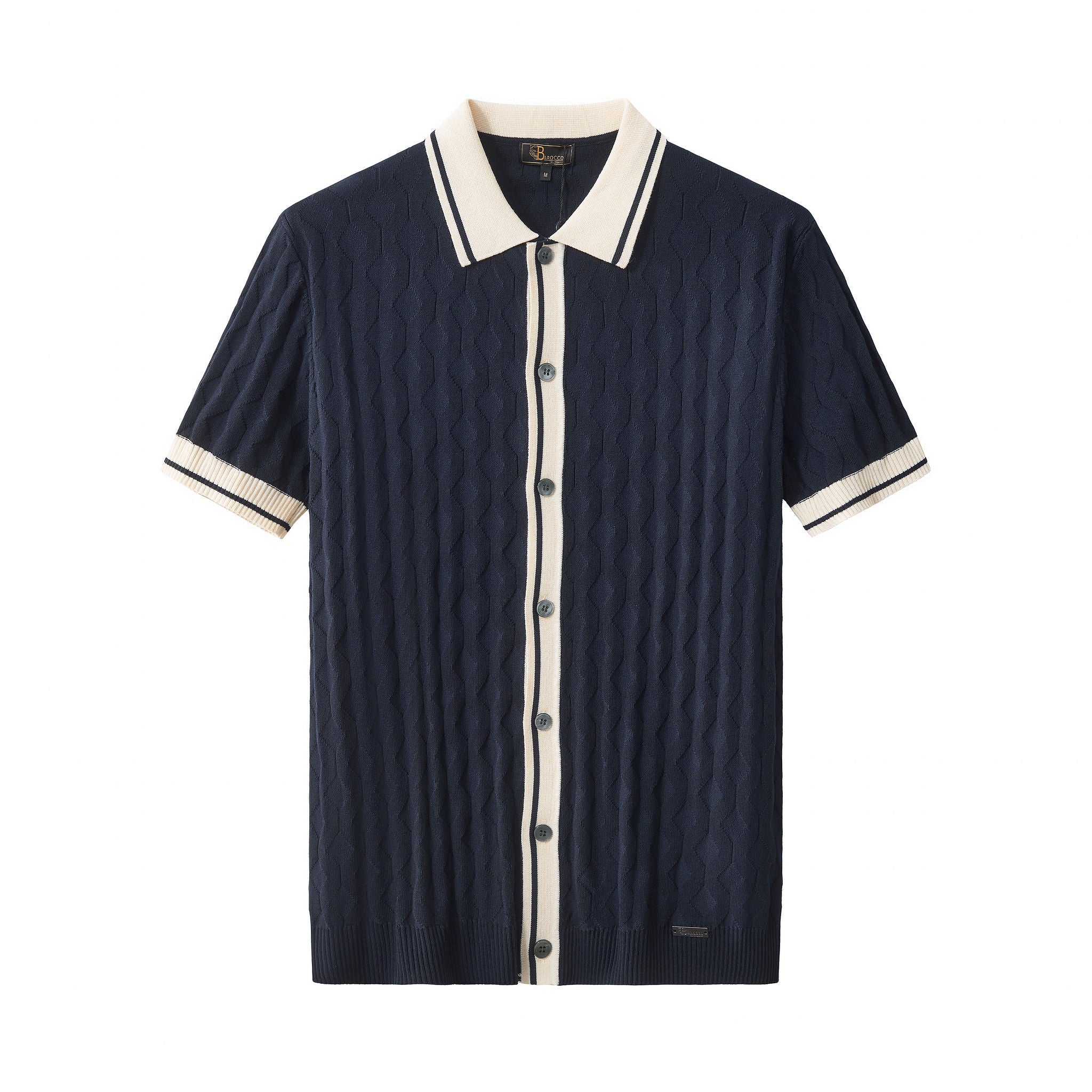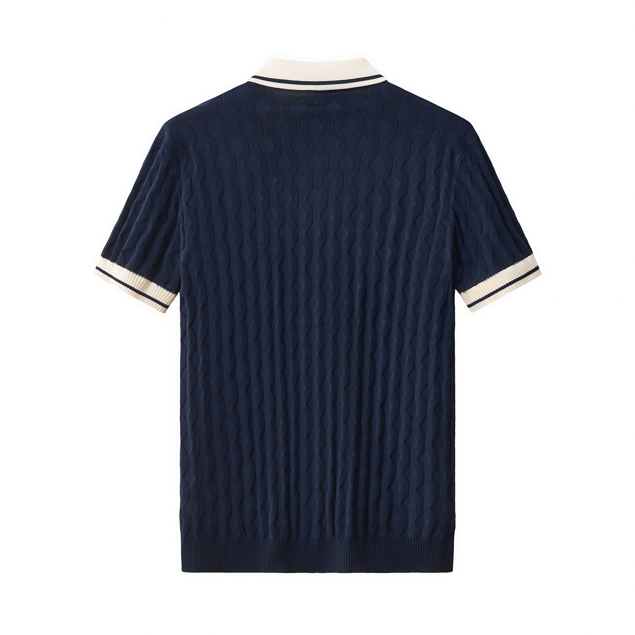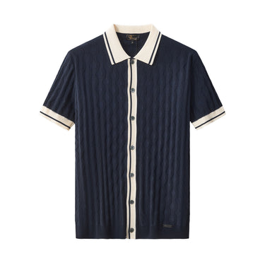 A refined short sleeve knit shirt designed with an elevated vintage-inspired sensibility, featuring a richly textured geometric knit body accented by contrast trim detailing that delivers depth, structure, and a sophisticated modern-retro statement.